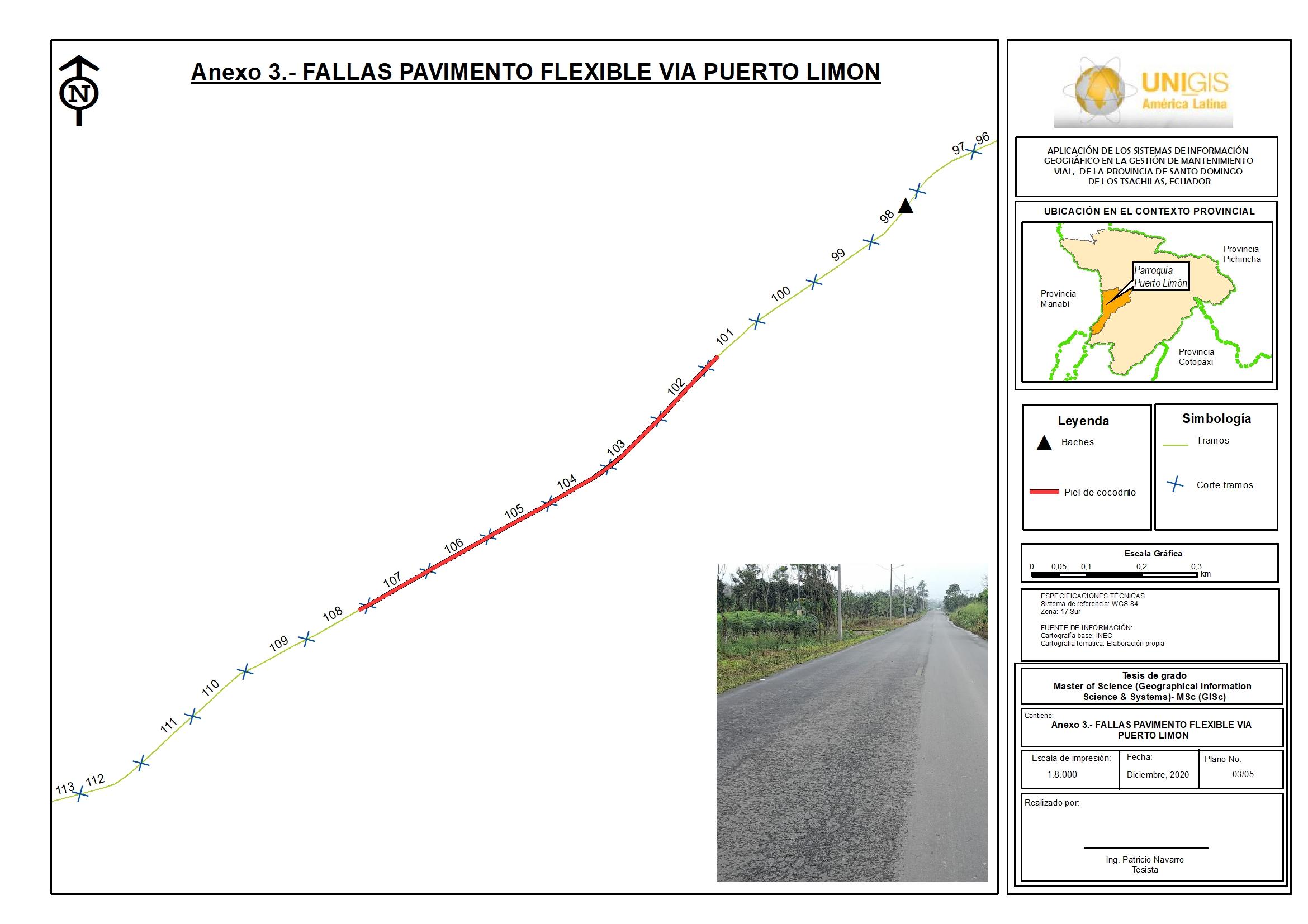GAD Provincial Santo Domingo de los Tsachilas. (30 de Junio de 2015). ASFALTAN LA VÍA A PUERTO LIMÓN. Recuperado el: 20 de septiembre de 2020. Obtenido de http://www.gptsachila.gob.ec/index.php/7-blog/193-asfaltan-la-via-a-puertolimon Garnica, A., Gómez, L., y Sesma, M. (2002). Mecánica de materiales para pavimentos. Qro, México. Geovial. (2010). Estudios Definitivos del Proyecto: “Acceso a los Barrios Jaime Roldós y Pisulí”. Quito. Gobierno Autonomo Descentralizado Parroquial Rural Puerto Limon. (2015). Actualización PDOT parroquial de Puerto Limón 2015 - 2030. Recuperado el: 14 de diciembre de 2020. Obtenido de http://app.sni.gob.ec/snilink/sni/PORTAL_SNI/data_sigad_plus/sigadplusdiagnostico/1768048310001_0 2%20Puerto%20Lim%C3%B3n%20-%20Diagn%C3%B3stico_15-05-2015_1548-47.pdf Ibraheem, A. T., y Falih, D. A. A.-R. (2012). Applying Geographic Information System (GIS) for Maintenance Strategy Selection. Engineering, 04(01), 44–54. Recuperado de: 11 de noviembre de 2019. Obtenido de: https://doi.org/10.4236/eng.2012.41007 Instituto Bolivariano del Cemento y el hormigón. (2012). Manual de Pavimentos Rígidos tomo 2 normas para pavimentos rígidos. Recuperado el 15 de septiembre del 2020. Obtenido de https://www.obraspublicas.gob.ec/wpcontent/uploads/downloads/2015/04/LOTAIP2015_tomo_2__normas.pdf Instituto Geográfico Militar del Ecuador. (2018). Catalogo de Objetos Versión 4.0. Recuperado el: 13 de nvoiembre de 2020. Obtenido de http://www.geoportaligm.gob.ec/cartografia/50kxcartas/1%20Informaci%C3%B 3n_Adicional/CATALOGO_OBJETOS_IGM-Vers-4.pdf Ministerio de Obras Públicas y Comunicaciones. (1990). Identificación de fallas en pavimentos y técnicas de reparación. Recuperado el: 14 de septiembre del 2020. Obtenido de https://www.mopc.gob.do/media/2335/sistemaidentifici%C3%B3n-fallas.pdf Ministerio de Transporte y Obras Publicas. (Octubre de 2013). Norma Ecuatoriana VialNEVI 12 - MTOP. Recuperado el: 15 de septiembre del 2020. Obtenido de https://www.obraspublicas.gob.ec/wp-content/uploads/downloads/2013/12/0112-2013_Manual_NEVI-12_VOLUMEN_6.pdf Ministerio de Transporte y Obras Publicas de Ecuador. (s.f.). Valores/Misión/Vision . Recuperado el: 15 de septiembre del 2020. Obtenido de https://www.obraspublicas.gob.ec/valores-mision-vision/ Ministerio de Transporte y Obras Publicas del Ecuador. (Febrero de 2014). Apoyo a la Preparación del Programa de Infraestructura Vial EC-L1065 EC-TS/N. Recuperado el: 15 de septiembre del 2020. Obtenido de https://www.obraspublicas.gob.ec/wpcontent/uploads/downloads/2017/01/LOTAIP_1_101963-APOYOPROGRAMA-INFRAESTRUCTURA-VIAL.pdf