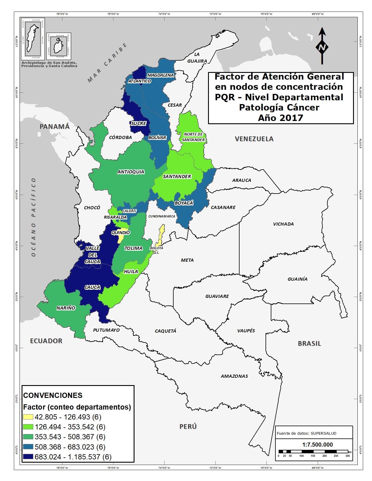 Mapa del Factor de Atención General en los nodos de concentración de PQR - Nivel Departamental para la patología de Cáncer, año 2017