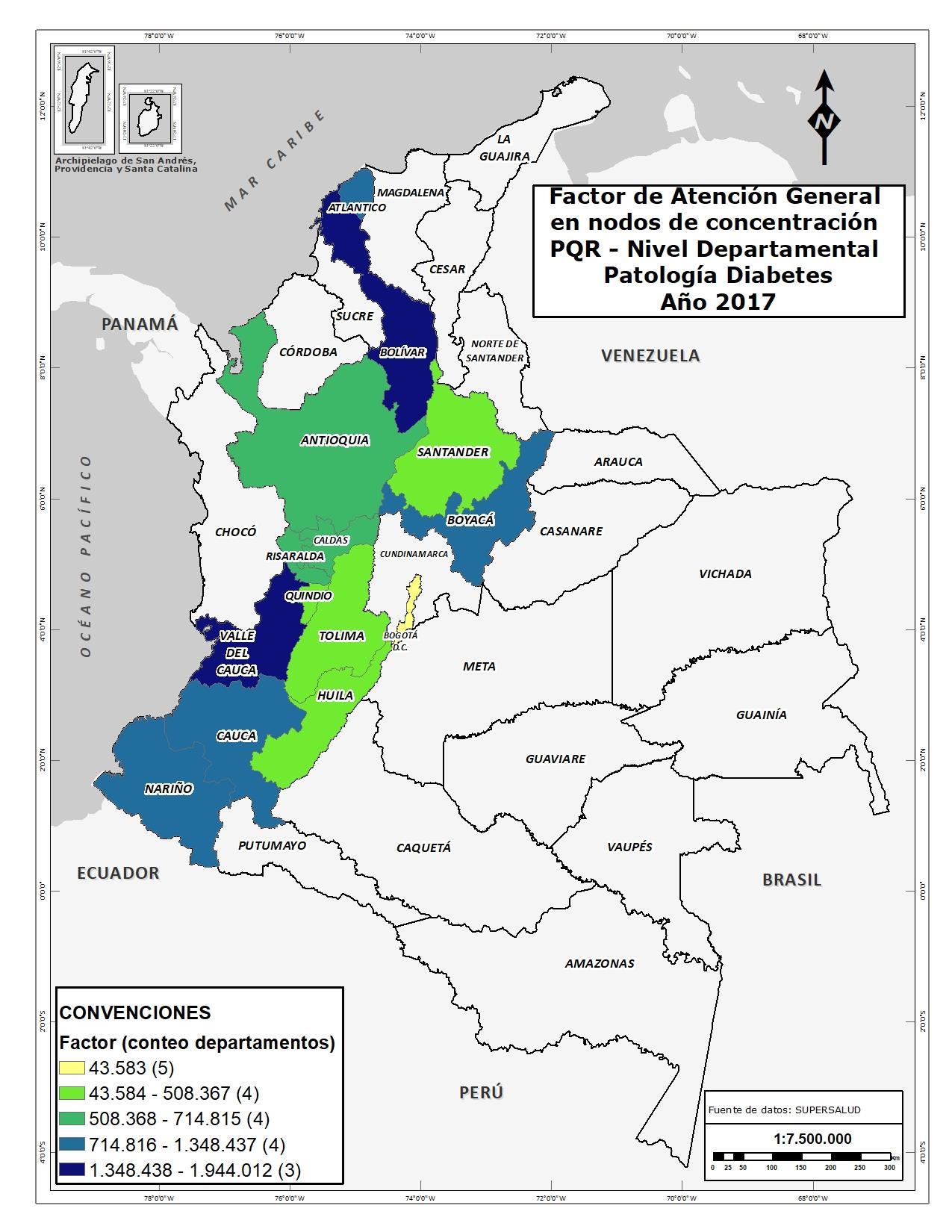 Mapa del Factor de Atención General en los nodos de concentración de PQR - Nivel Departamental para la patología de Diabetes, año 2017
