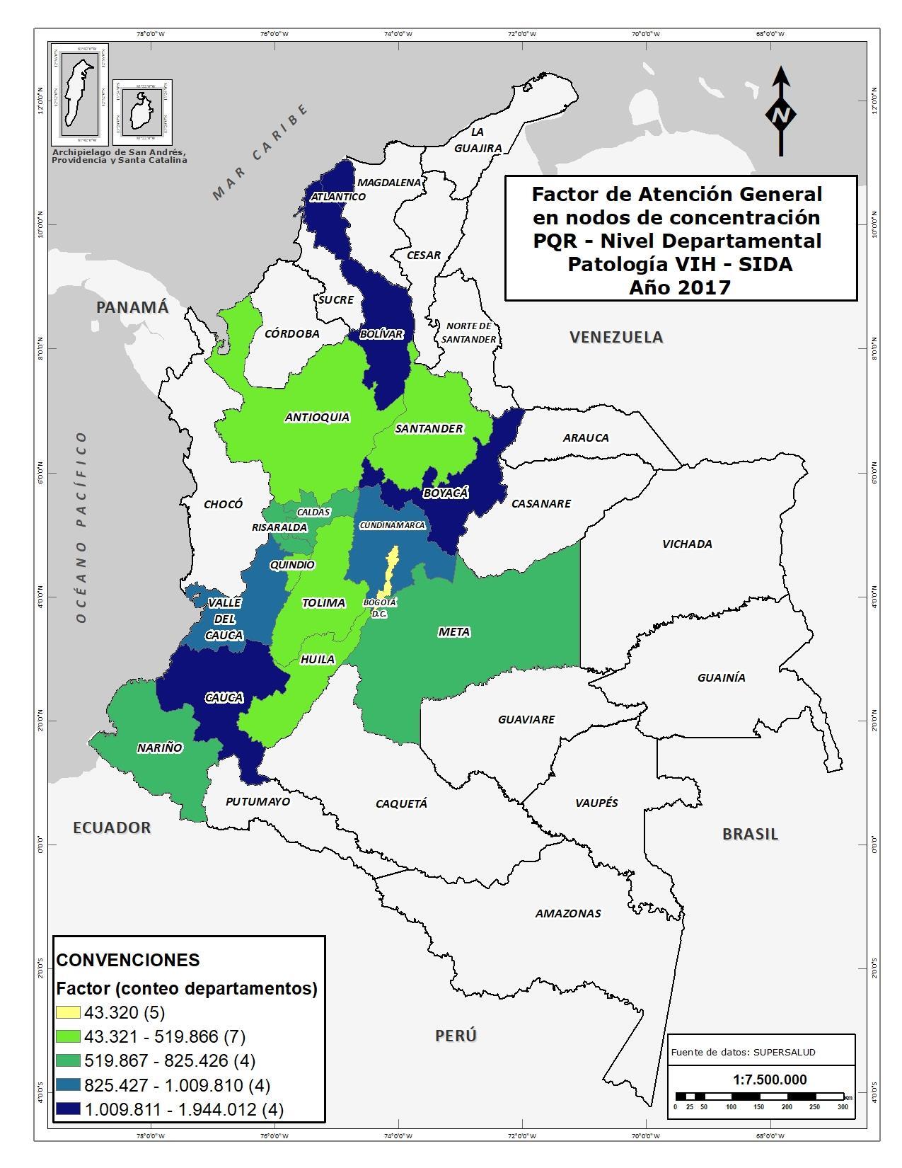 Mapa del Factor de Atención General en los nodos de concentración de PQR - Nivel Departamental para la patología VIH- SIDA, año 2017
