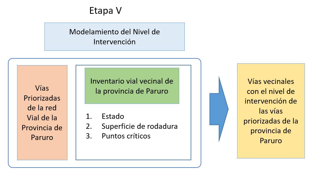En la etapa V en el modelamiento del nivel de intervención se presenta en la figura 5, donde en base a las vías priorizadas de la red vial de la provincia de Paruro, determinadas en la etapa IV, con información del inventario vial del estado, tipo de superficie de rodadura y puntos críticos se determina el nivel de intervención de la red vial provincial.