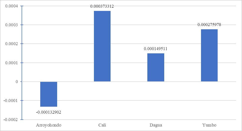 Mediante el test de Wilcoxon se comprueba estadísticamente la significancia de los datos de mediana de ESDR, a partir de los resultados de los p-valor (Tabla 12). De esta manera, se establece que las medianas del valor ESDR correspondientes a las cuencas Arroyohondo, Cali y Dagua son estadísticamente significativas. Así, dado que se tiene un ESDR negativo para la cuenca del río Arroyohondo en el ACB San Antonio/Km 18, se confirma que la oferta no satisface la demanda de agua.