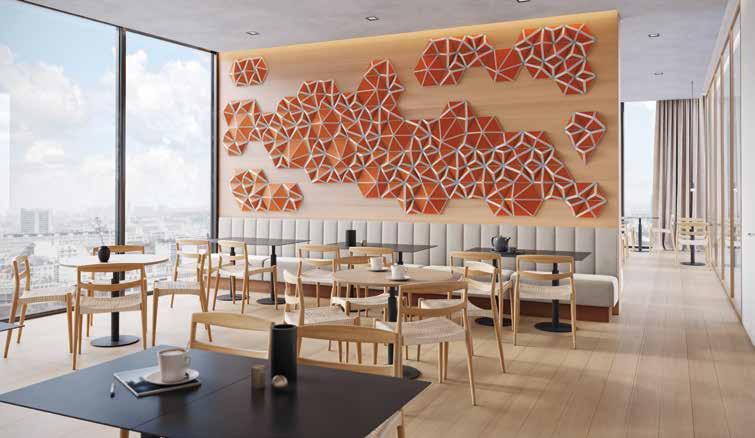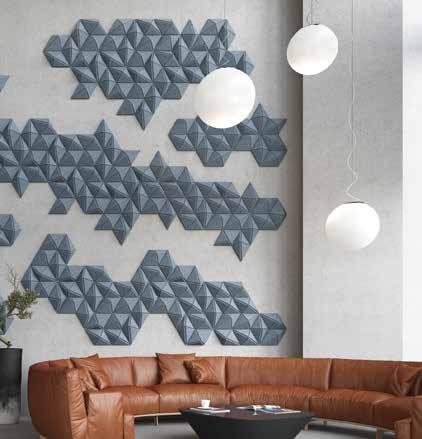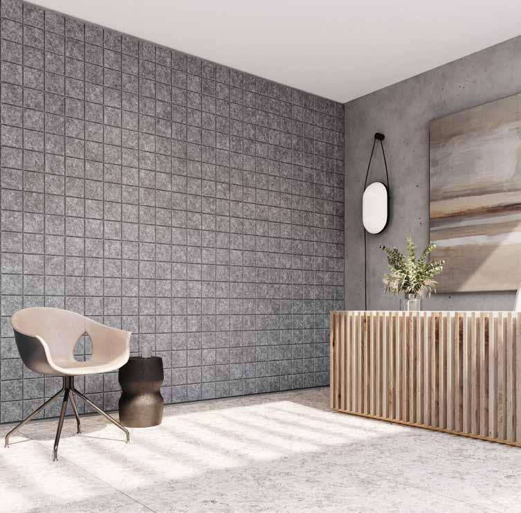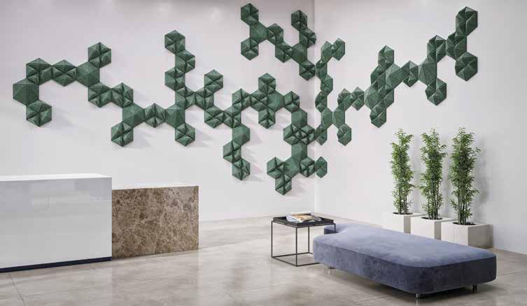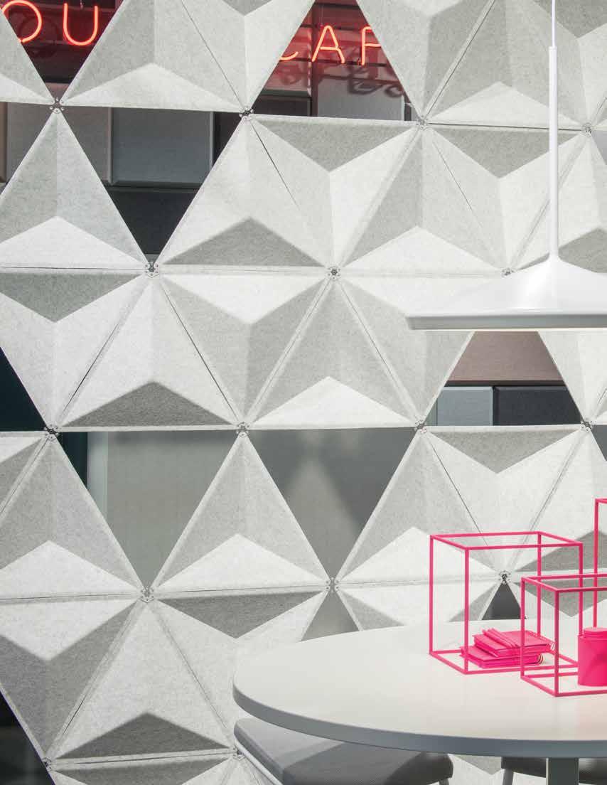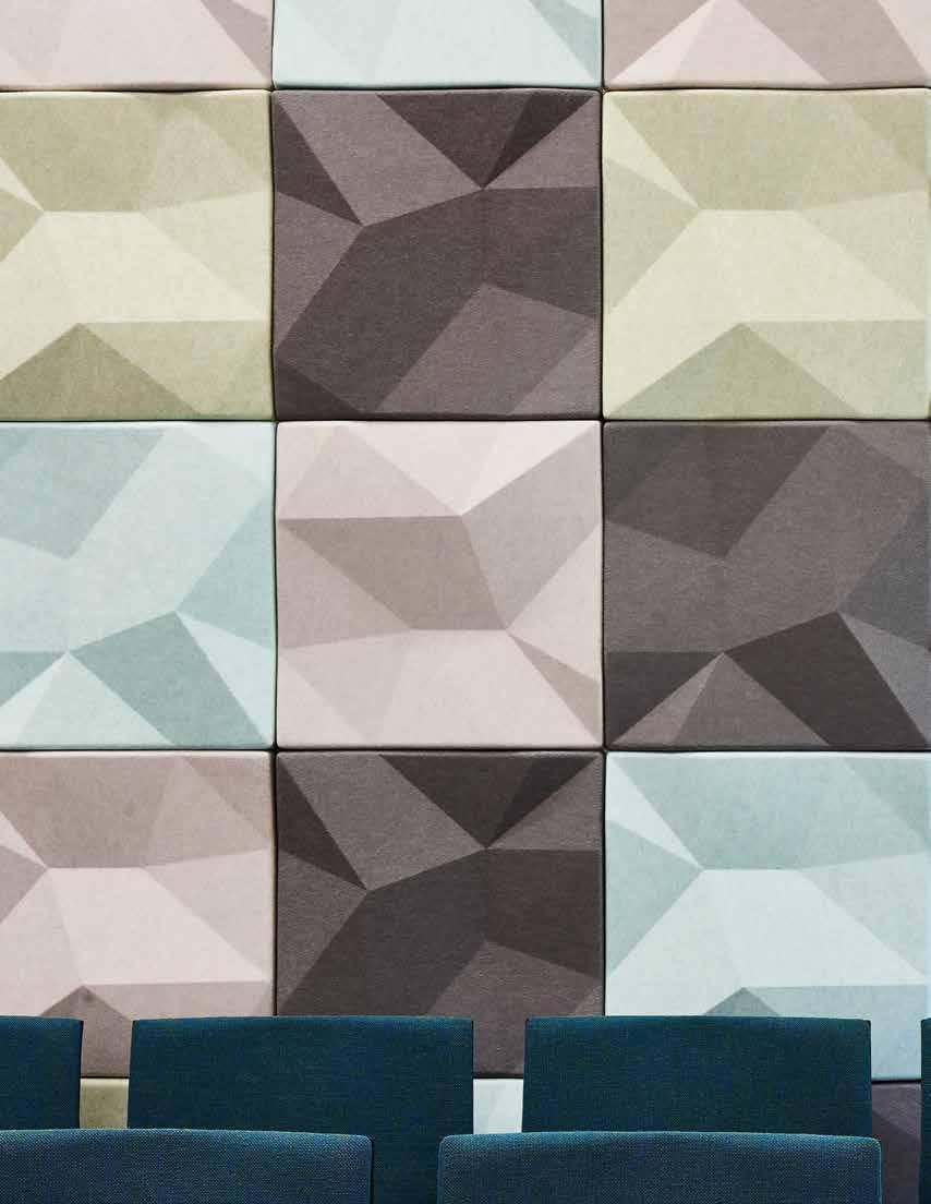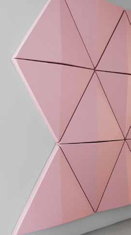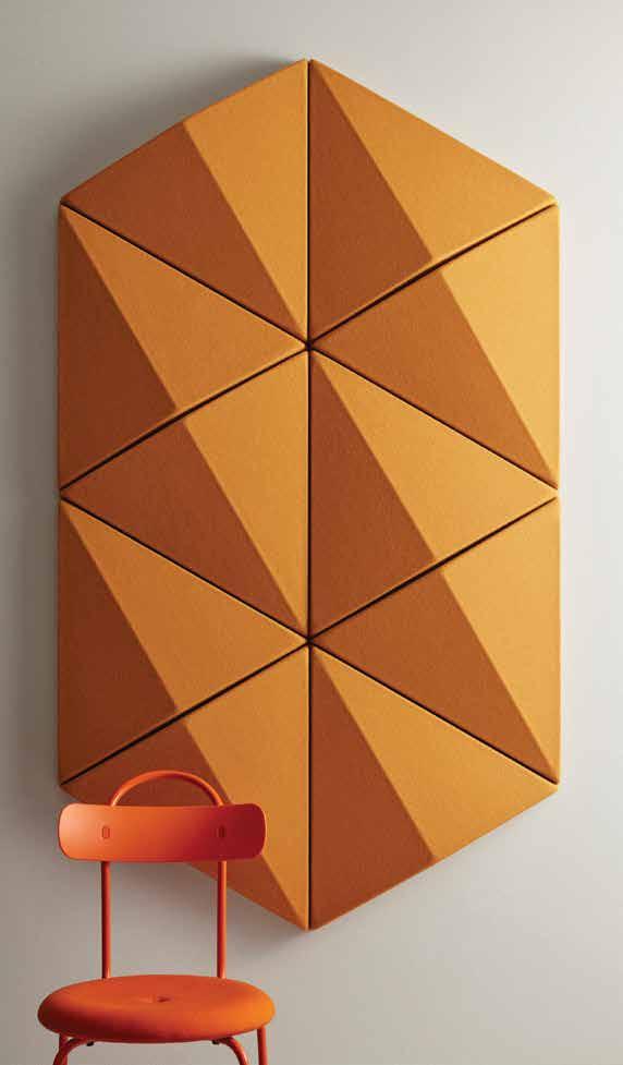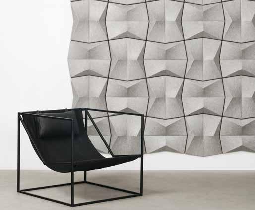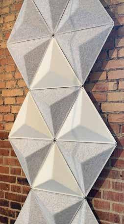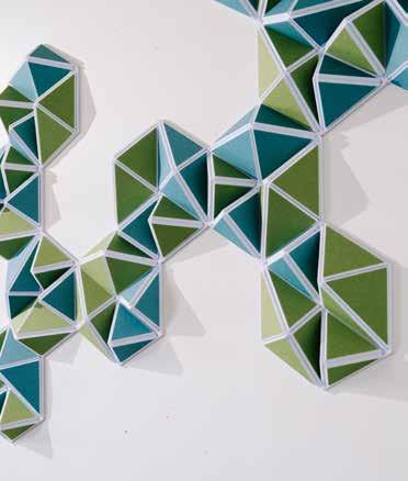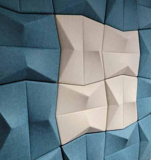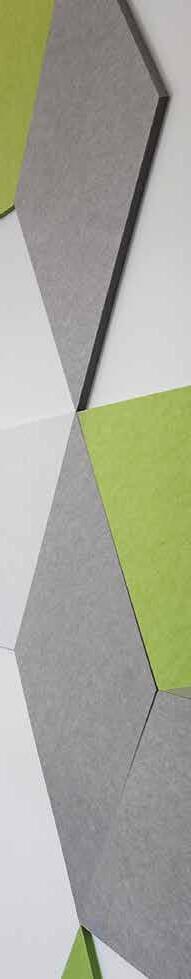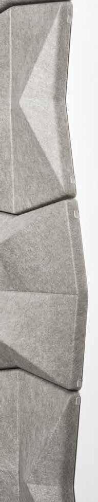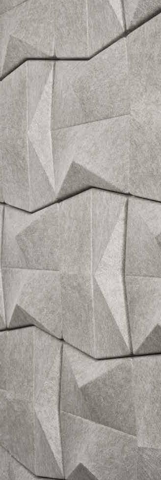 The Folded Poetry Collection by Eliza Redmann is a multi-dimensional expression of her journey recovering from traumatic brain injury. Drawing inspiration from her altered perception of reality, the collection’s Diad, Triad, and Hexad designs feature directionally scattered surfaces that not only disperse and absorb sound but also visually evoke the sensation of disorientation. Available in an array of Ecoustic® Solid Color Core ore colorways and a vast selection of Wilsonart® printed patterns, these designs can be used individually or combined to produce limitless customizable patterns, adapting to various spatial applications. Crafted from PET, Folded Poetry seamlessly merges art and functionality, addressing aesthetic and acoustic challenges while offering a profound reflection of resilience and recovery.