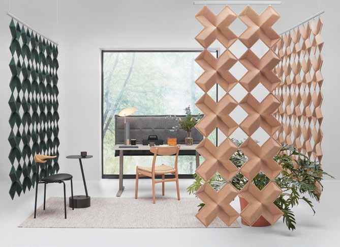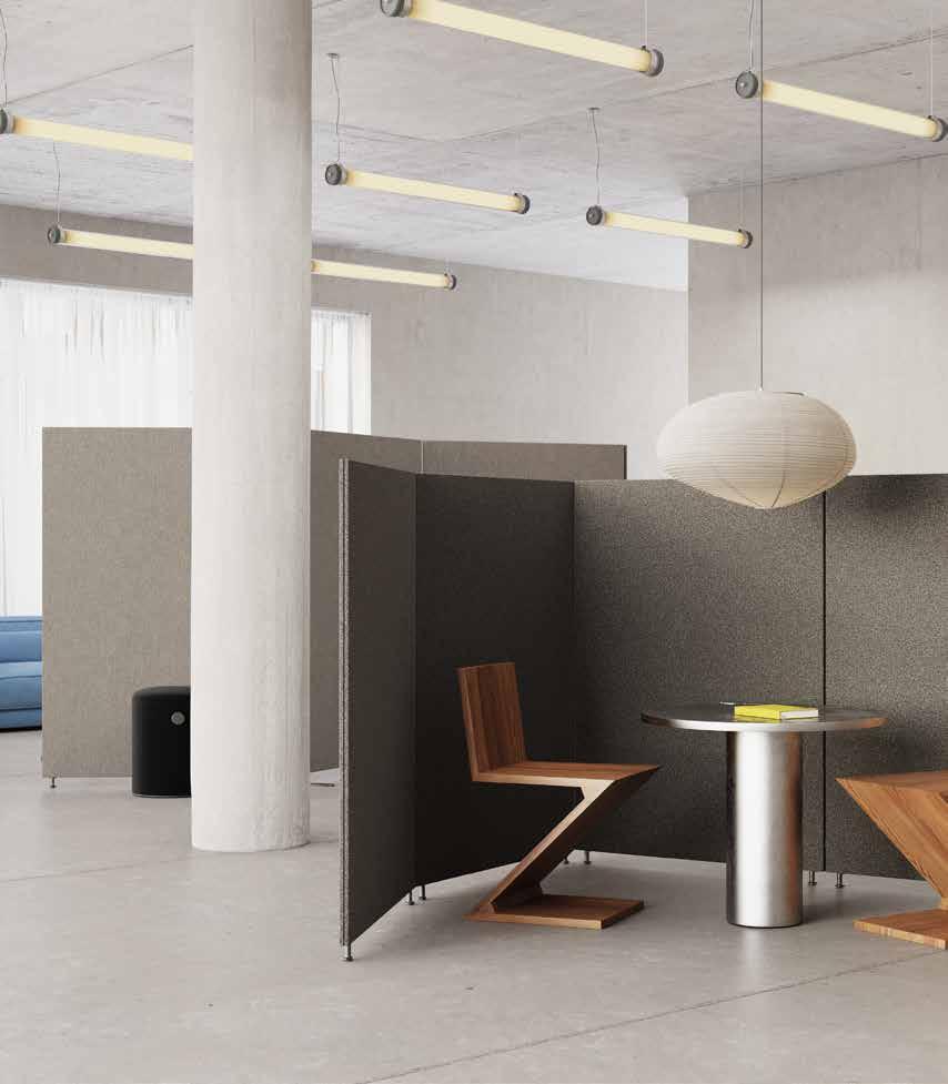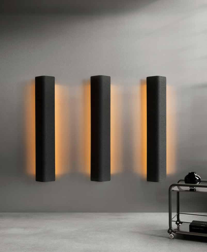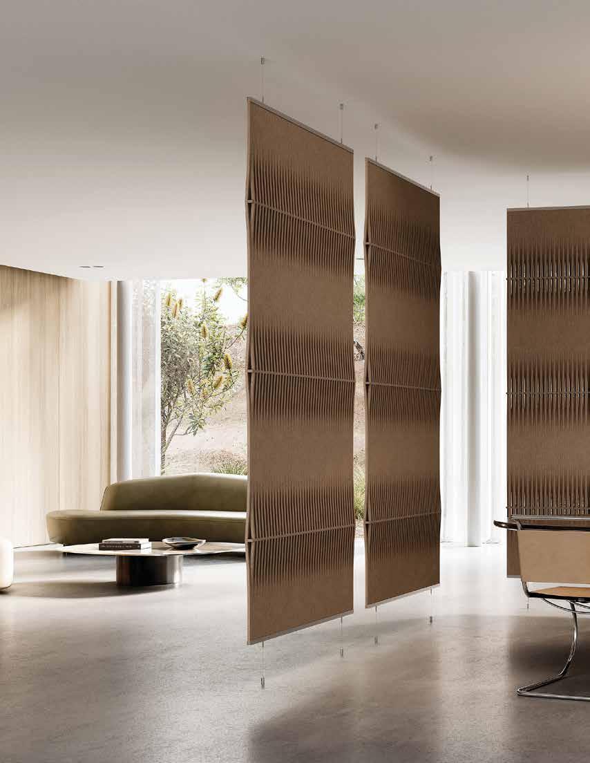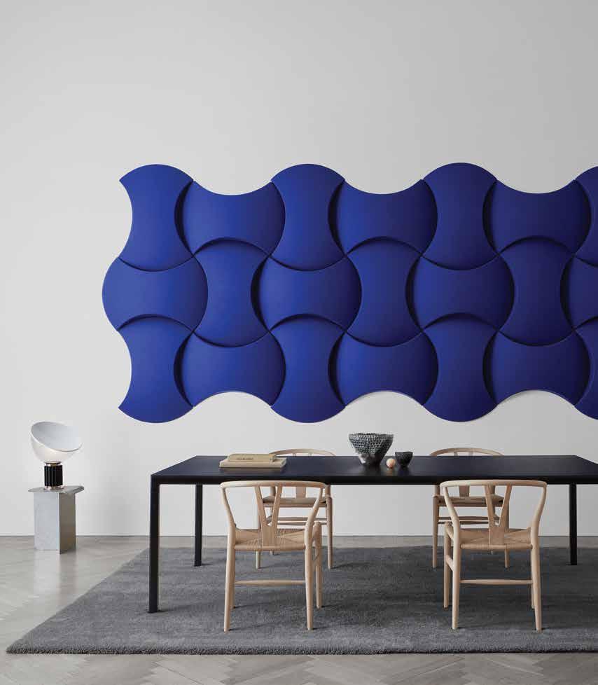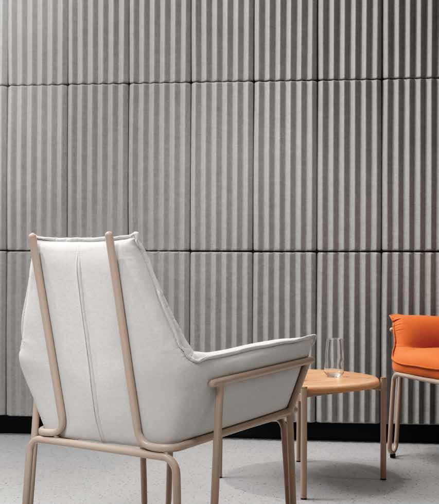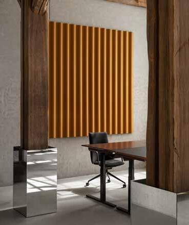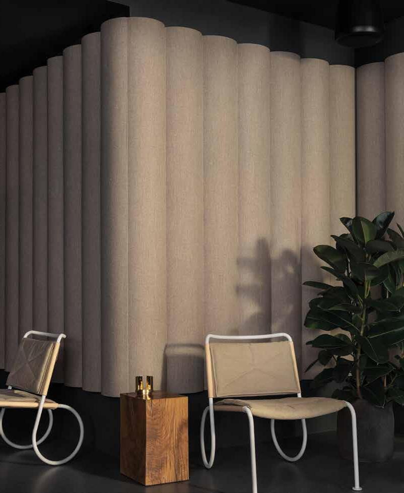 Designed by Anya Sebton, Scala Wall Panel embraces the timehonored principle of ‘Form Follows Function’. Finding inspiration in Icelandic construction methods, Scala Wall Panel provides a softer soundscape, while also promoting the idea of ‘separate but together’. Scala Wall Panels are available in either portrait or landscape orientation and hung on concealed brackets mounted to the wall. Scala Wall is available in two different sized profiles, 63″ x 47.5″ or 90.5″ x 47.5″, custom sizes also available.