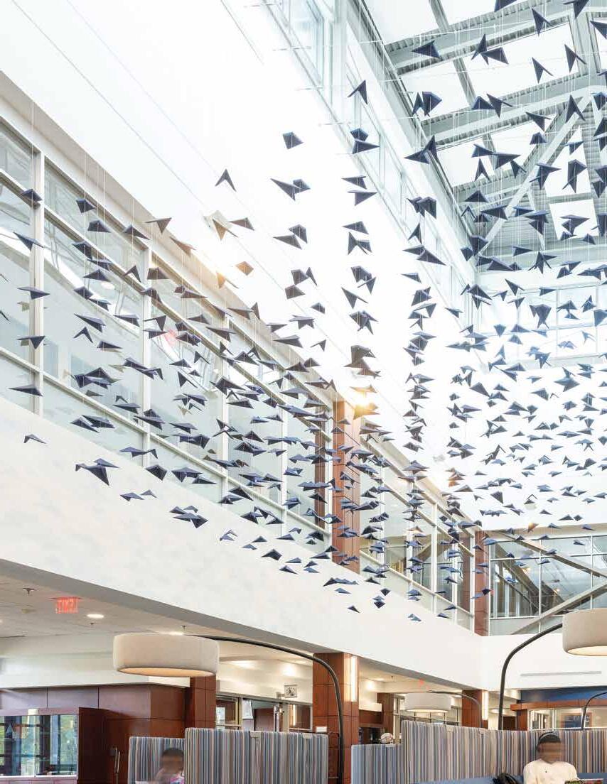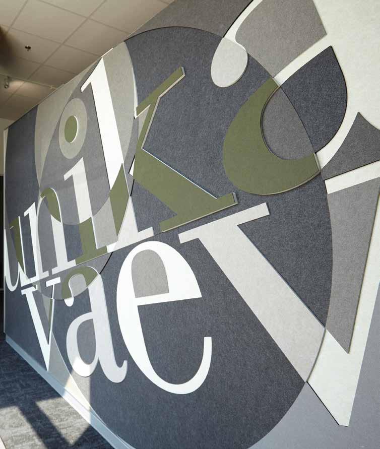 Select a piece of art, a logo, or a message, or opt for one of the carefully curated printed patterns from the Wilsonart® collection through Unika Vaev Design Studio’s Digital Print Program to enhance the acoustic environment of any space. The program employs state of the art, high-resolution digital printing upon our Ecoustic® Solid Color Core Panels. Select any high-resolution photography or use your own custom graphics or signage to create a beautiful sound absorbing impactful design. If you choose to go for an image art piece, check out Unika Vaev’s large library of images on our website, or provide your own. Maximum print size on one panel is 47.75″ x 108″. Larger expanses can be achieved through Unika Vaev’s Custom Design Studio.