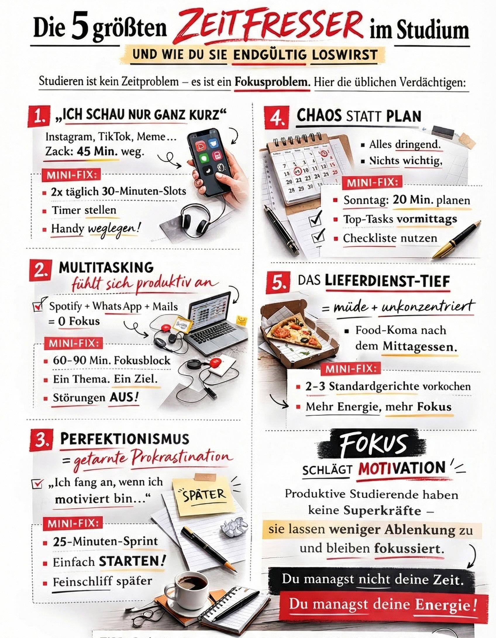 Plane deine Woche nicht nach To-dos, sondern nach Energie. Lege anspruchsvolle Aufgaben in deine produktivsten Stunden – meist vormittags – und blockiere fixe Lernzeiten wie Vorlesungen. Social Media & Orga-Kram kommen in klare 30-Minuten-Slots. Ergebnis: weniger Stress, mehr Fokus, bessere Noten. Du managst nicht deine Zeit – du managst deine Energie. Das ist der Unterschied. Und genau dort entsteht echter Fortschritt im Studium.
