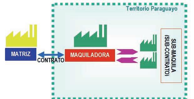 El sistema de maquila sigue un modelo que implica una entidad contratante en el extranjero (la matriz) y una empresa contratada (la maquiladora) que opera en cualquier parte del territorio de Paraguay.