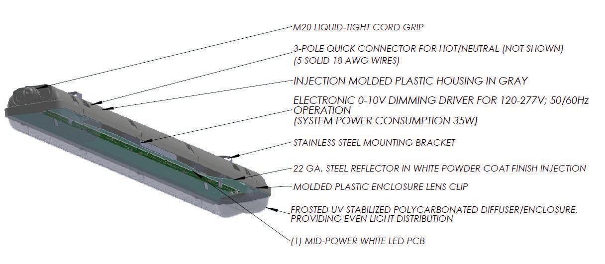 Construction: Dead front (non-metallic) luminaire with spring clips for easy installation. Gasket included for airtight and wet location listing without additional caulking.