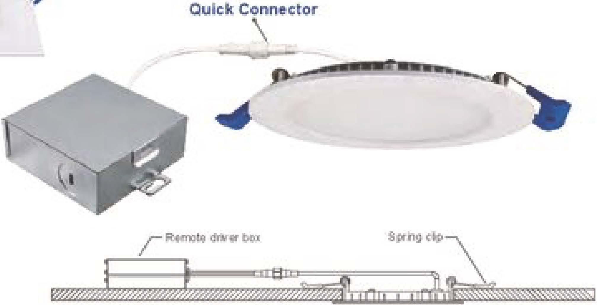 Mounting: No housing is required, two tensions steel spring clips secure luminaires to the ceiling. Luminaires accept ceiling thicknesses from 3/8 " to 5/16 ". New construction frame-ins are available, see accessories.