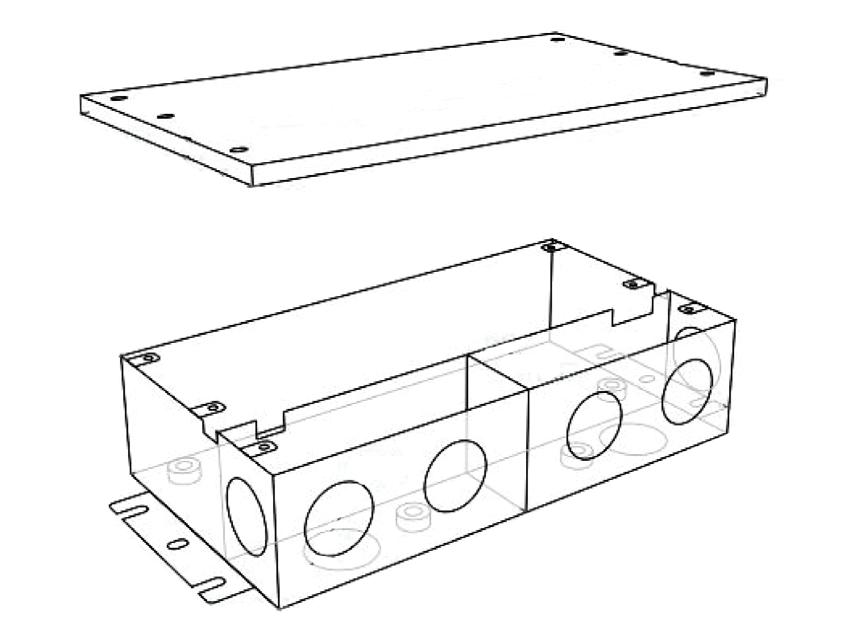 Junction Box: Pre-wired 25 cubic inch 0.064” thick galvanized steel, with seven 1/2” knockouts, four Romex® pryouts, and snap on covers. All leads are #18AWG wire, the ground wire is connected to the bottom, and quick connectors are supplied on all leads. Through branch circuit wiring, (4-in, 4-out). Access above ceiling required. ACCESS ABOVE CEILING REQUIRED.