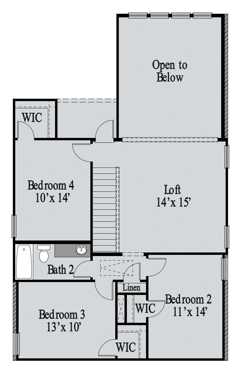 The Walton presents a spacious two-story, 4 bedroom open floor plan — perfect for hosting family and friends. The welcoming foyer has two entrances from the front door and garage, and leads to a spacious family room, passing a powder room, laundry room, and mudroom along the way. The family room flows into the elegant dining room and welldesigned kitchen while also offering direct access to a serene covered patio. The kitchen provides bar space, plenty of counter and storage space, and a walk-in pantry. Behind the kitchen lies the primary suite with a beautiful bathroom featuring a dualsink vanity, sparkling glass shower, and walk-in closet. The second floor houses an open loft area and three more bedrooms, each with its own walkin closet and access to a full shared bathroom showcasing dual-sink vanity, a linen closet, and a combination shower and bathtub.