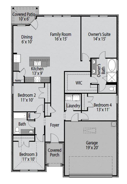 The San Jacinto floor plan is a spacious and well-designed home spanning 1,861 square feet. This 4-bedroom, 2-bathroom residence offers a comfortable and functional layout suitable for modern living. The open concept living and dining areas create a seamless flow, providing ample space for family gatherings and entertaining guests. The primary bedroom comes complete with an en-suite bathroom, featuring dual sinks for added convenience and a luxurious soaking tub for relaxation. With its thoughtful design and practical amenities, the San Jacinto floor plan is a perfect blend of style and comfort, creating an inviting and enjoyable living space for residents.