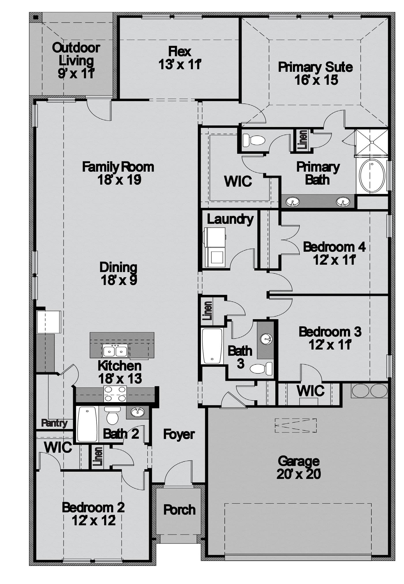 The charming Colorado features a covered porch and covered patios, making it easy to enjoy outdoor living. A marvelous flex room is centrally located to the secondary bedrooms, providing a great alternative living space for multi-generation entertaining. The secondary bedrooms include private full bath and walkin closets. The Colorado also boasts a magnificent open kitchen with a large island, plenty of counter space and a spacious breakfast area. The expansive primary bedroom offers a sumptuous bath with dual vanities and an enormous walk-in closet.