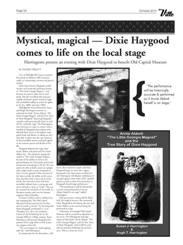 Mystical, magical — Dixie Haygood comes to life on the local stage Harringtons present an evening with Dixie Haygood to benefit Old Capital Museum By VALERIE NIBLETT One of Milledgeville’s many mysteries lies quietly in Memory Hill Cemetery under an unassuming concrete and granite marker. Dixie Annie Jarratt Haygood, world traveler and renowned performer known as “The Little Georgia Magnet,” rests beneath an ancient cedar tree in cool shade. Her life was filled with personal tragedy and home grown mystical magic that enthralled audiences across the globe in the late 1800s and early 1900s. Milledgeville writers/historians Susan and Hugh Harrington recently coauthored the book “Annie Abbott: ‘The Little Georgia Magnet’ and the True Story of Dixie Haygood” depicting Haygood’s complex and interesting life both on and off the vaudeville stage. The Harringtons were fortunate to come in contact with a handful of Haygood’s descendants who allowed them access to her papers, autograph book and diaries. In doing so, they were able to delve into the true existence of this incredible woman and pull together the intimate pieces and details of her life. Haygood adopted the stage name Annie Abbott and perfected The Annie Abbott Act. She stood out among the crowd as “The Little Georgia Magnet” because of her ability to stick to the ground despite her 96 pounds and several strong men attempting to lift her. She was said to be able to hold a pool cue upright with a light touch as men attempted to force it to the ground. Other recounts of her fame include the ability to lift a man from the floor with a mere touch of her hands. She claimed to have had these incredible abilities from a young age and never referred to them as “tricks.” She easily captured the attention of the world, its European royalty and even the famous magician Harry Houdini. In honor of Dixie and to celebrate her awe-inspiring life, The Old Capital Historical Society presents for the first time in nearly a century “An Evening with Dixie Haygood” performed at 7 p.m. Thursday, Oct. 28 at the Goldstein Center of the Performing Art on the Georgia Military College campus. Susan Harrington will portray Haygood and a portion of her stage show as well as present snippets of her life. “The event began as a book signing and talk,” said Harrington. In preparation for the discussion, a dif-