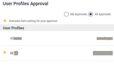 Company users tasked with the responsibility of approving new system users and changes to existing user profiles can add this panel to view and act on all user profiles pending approval. The user can select the profile to go to associated pages where they can take the appropriate action. Buttons at the top of the panel allow a company user to view only those profiles requiring their approval or all profiles requiring approvals. If no profiles are pending approval, the following message appears: