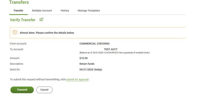 Company users responsible for reviewing payment and transfer requests can add this panel to view and act on transfers and payments pending approval for the following services: