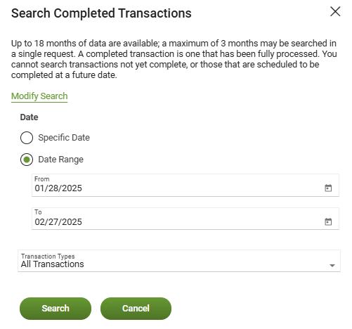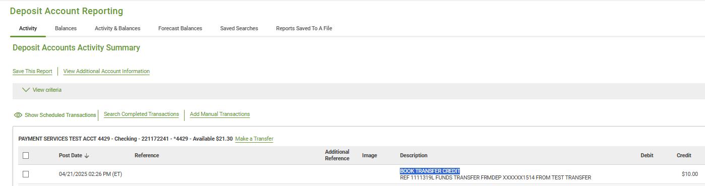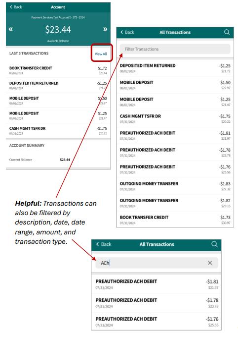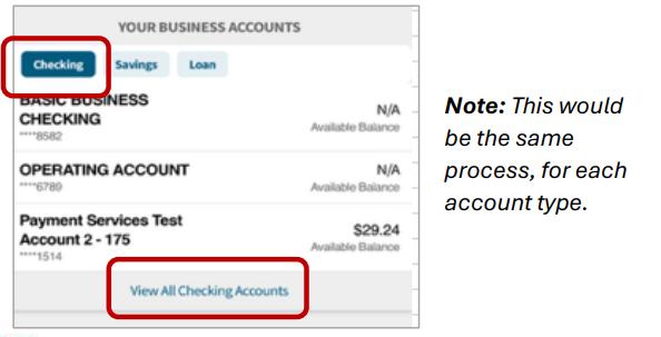 The Recent Transactions panel allows company users to view 25 transactions from the last 30 calendar days for an entitled checking, savings, or credit card account.