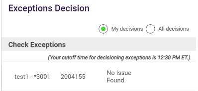 2. If the user has no check exceptions that require a decision or approval, the following message appears: