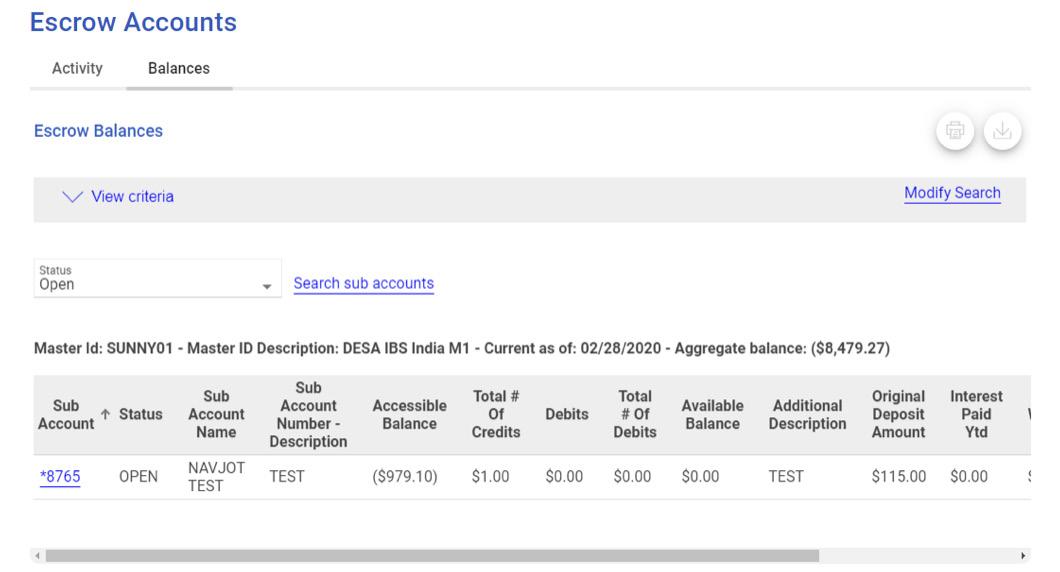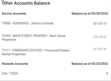 The Other Account Balances panel allows company users to view and access balances of entitled accounts of various types, such as escrow accounts, credit card rewards accounts, brokerage, or aggregating accounts.