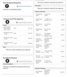 Company users responsible for reviewing check and ACH exceptions can add the Exceptions Decision panel to view and act on them. Buttons at the top of the panel allow a company user to view only those decisions requiring their approval or all decisions requiring approvals. Select any item to open the appropriate page for action.