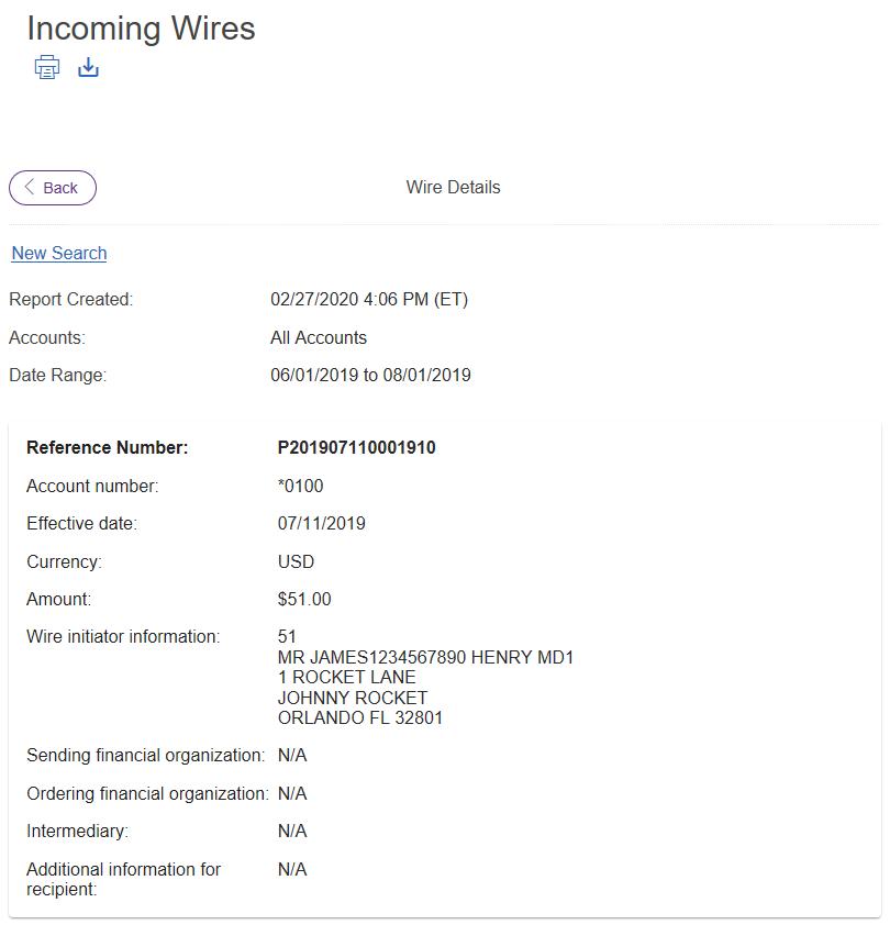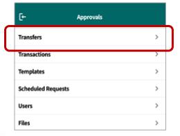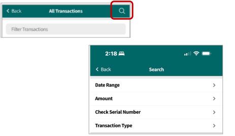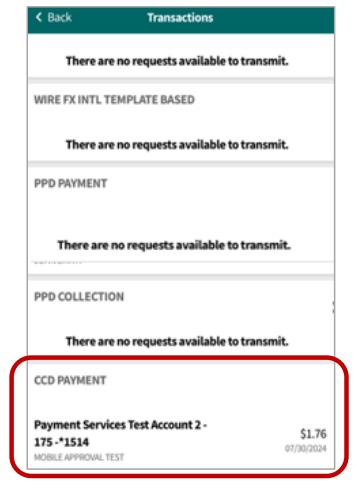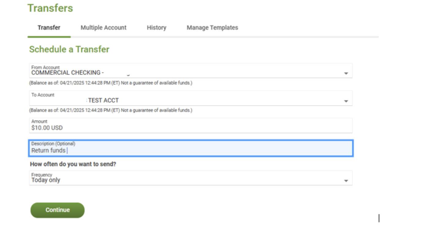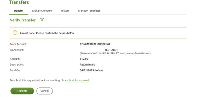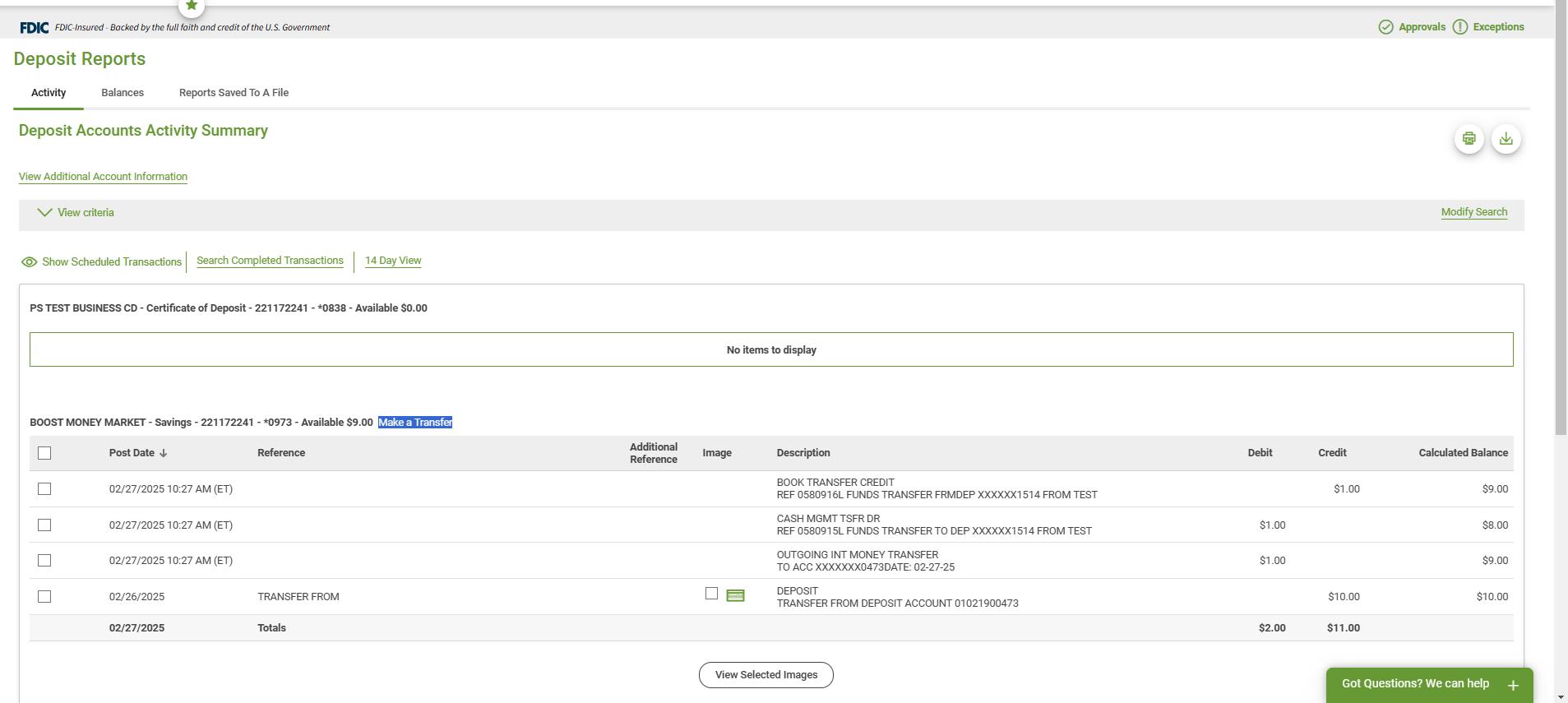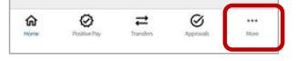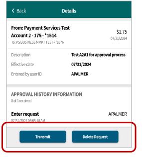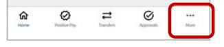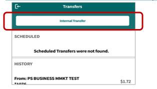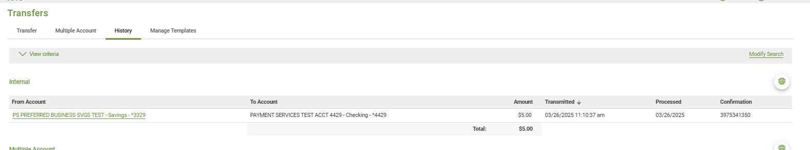 The Recent Transactions panel allows company users to view 25 transactions from the last 30 calendar days for an entitled checking, savings, or credit card account.