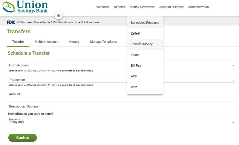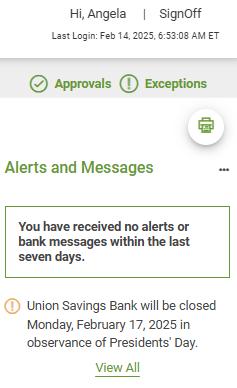 Business Online Banking Plus allows customers to assign multiple users to their company profile. Union Savings Bank establishes the Primary User as part of your company enrollment process.