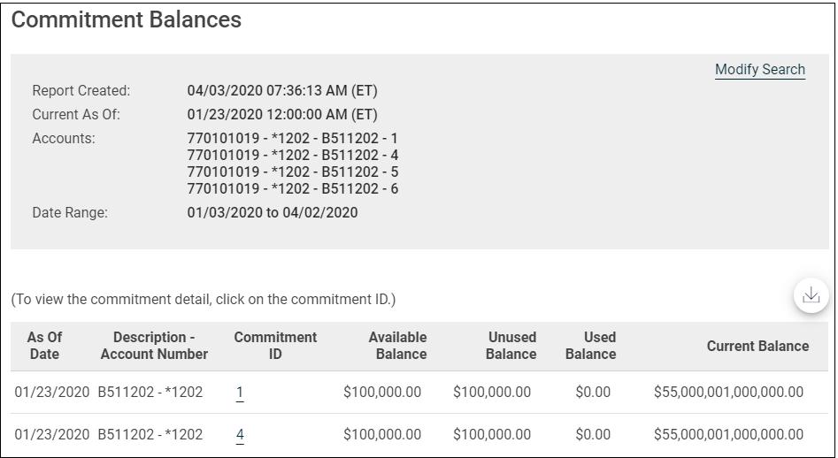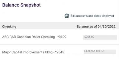Users can add the Balance Snapshot panel to view balances for a specific date in the past for entitled accounts, including: