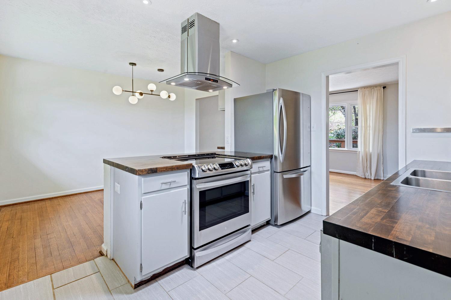 Kitchen: Updated with butcher block counters, tile flooring, and stainless steel appliances