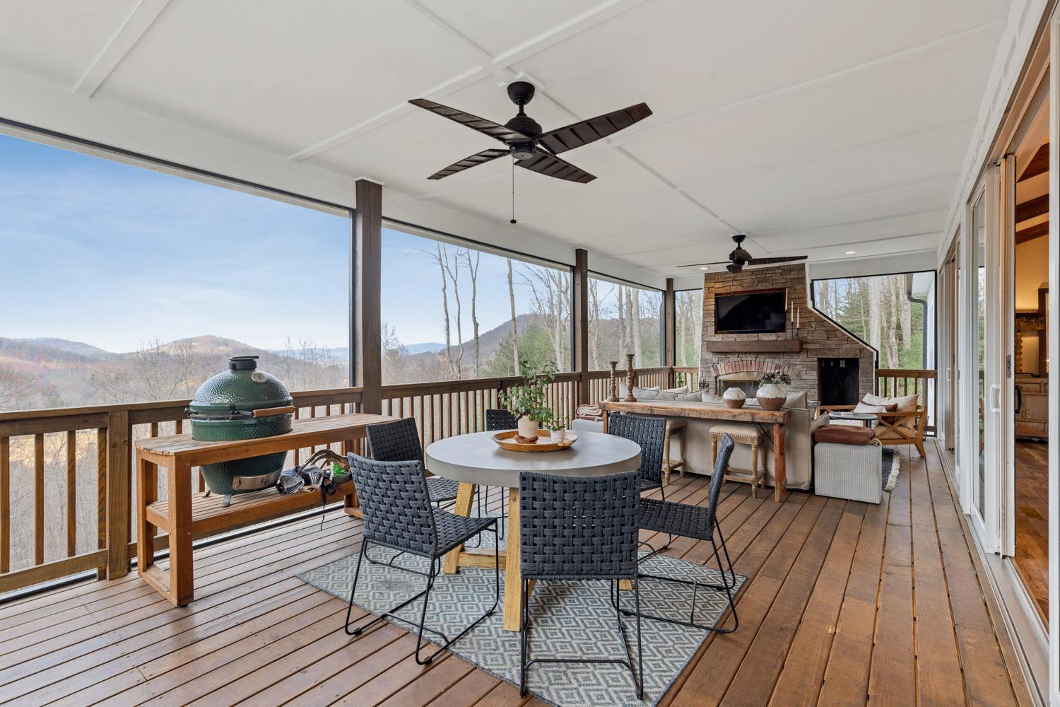 Screened porch with stone fireplace & stunning views