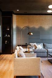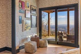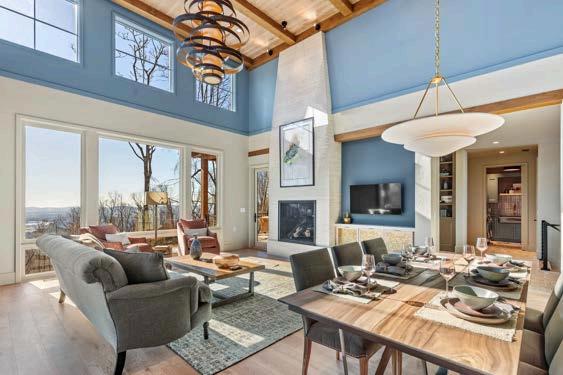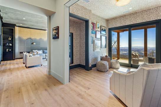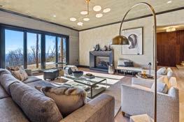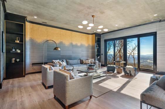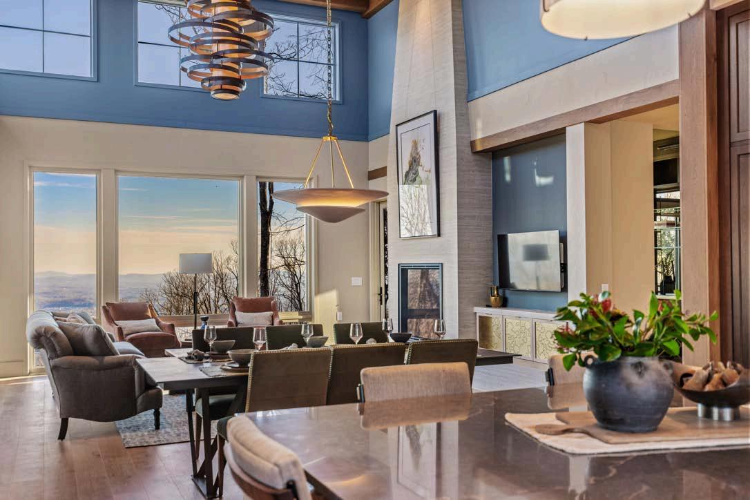 The parlor is a moody, intimate retreat featuring a striking soapstone-look fireplace with steel accents. Large windows frame stunning mountain views, while four unique wallpapers—plaster-painted walls, crushed velvet ceiling, burlap stripes, and velvet gray ombre—create a luxurious atmosphere. A built-in bar niche and scalloped curved walls enhance the flow, with uplighting highlighting the rich textures. Plush seating, a modern chandelier, and curated decor complete this sophisticated, cozy lounge, making it the perfect place to relax and unwind.