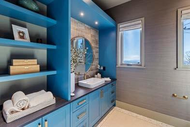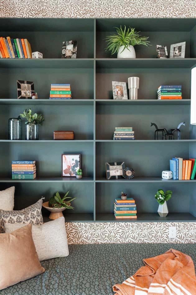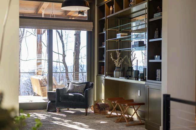 This versatile space, adorned with glass and metal shelves and warm mossy green walls, is perfect for relaxation and creativity. Art lights enhance the artwork, creating intimacy, while a floor outlet allows for conversion into a home office or gaming nook. Expansive windows provide stunning mountain views, and plush seating makes it an ideal retreat for reading or unwinding.