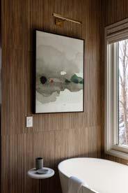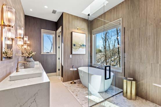 The ensuite is designed for relaxation, featuring natural textures and soft neutrals with warm fluted wood-paneled walls. It includes a zerothreshold glass shower for accessibility, a freestanding soaker tub under a skylight, brass sconces, a marble vanity, and hexagonal tiles for a luxurious feel. Thoughtful storage and layered lighting enhance this tranquil space.