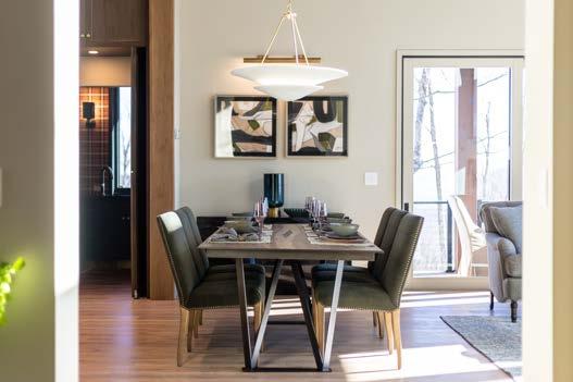 An open-concept dining area provides the perfect setting for intimate gatherings, while large glass doors offer uninterrupted views of the landscape beyond.