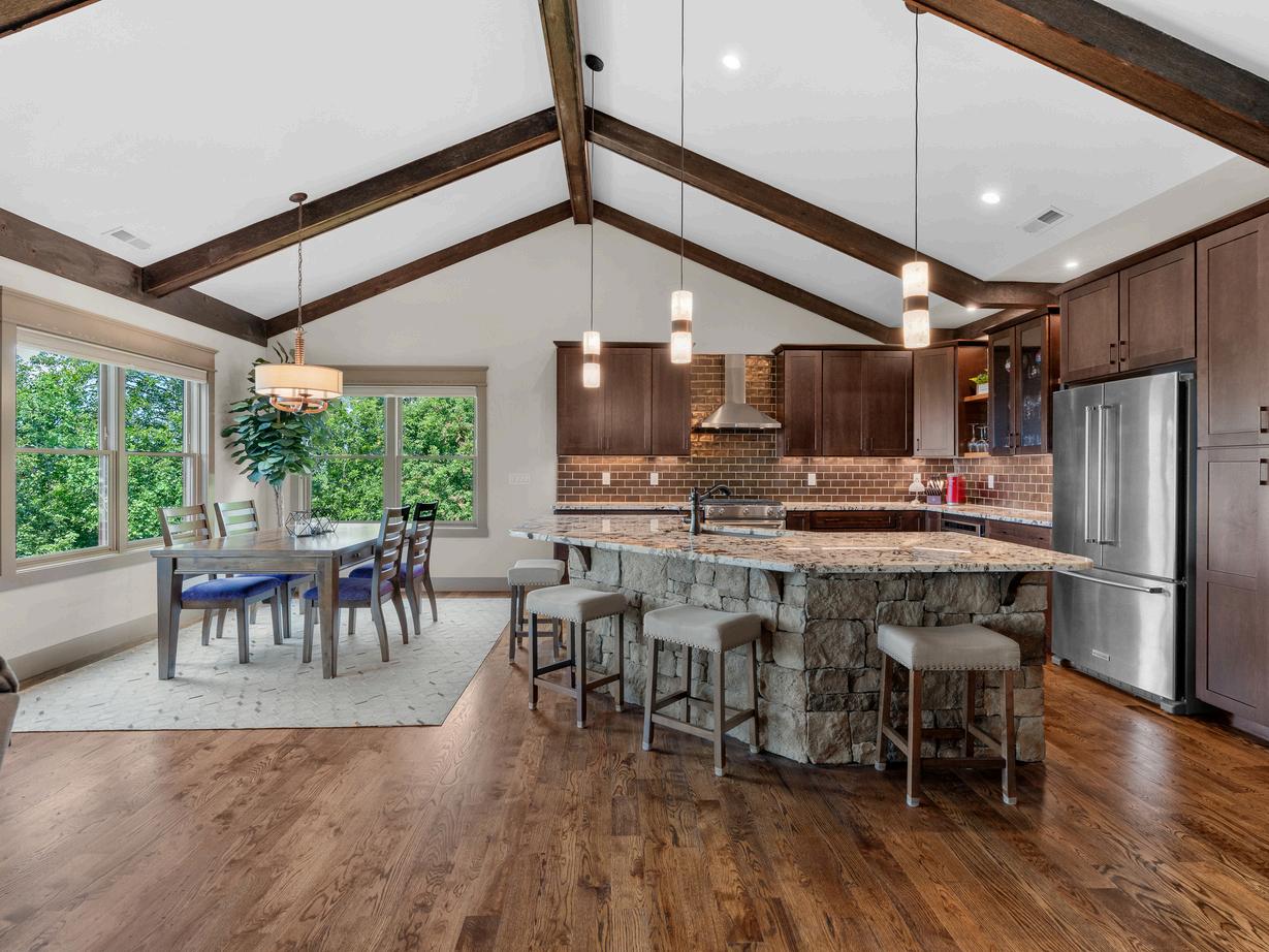 Open-concept great room with vaulted ceilings, exposed beams, and hardwood floors