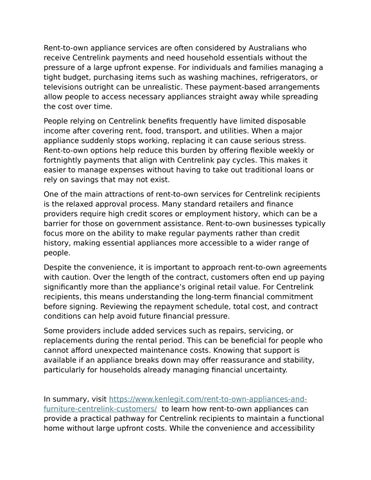 In summary, rent to own appliances centrelink can provide a practical pathway for Centrelink recipients to maintain a functional home without large upfront costs. While the convenience and accessibility