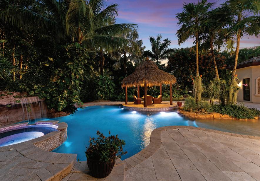 This exquisite gated estate on nearly 1 acre boasts award-winning architecture, a resort-style pool, stunning gardens, both basketball and volleyball courts, and a detached 2-bedroom, 2-bath guesthouse. See page 22 for more details.