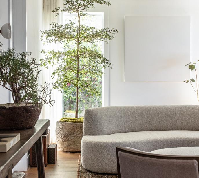 When evaluating an interior space, Block first assesses the lighting, which dictates what species can flourish in that location. “It’s important to get the scale right,” he says. “We strive to complement the interior architecture and design.” Favoring twisted trunks and patinaed vessels, the designer explains that “organic asymmetry and natural flaws become part of a plant’s character, creating a sense of calm and a meditative atmosphere.” He notes quieter, more contemplative compositions can transform a terrace or corner of a room into a serene, Zen-like retreat. Block cites juniper, bonsai black pine, maple, and Ficus palmeri as plants that bring a peaceful, reflective quality to a space.