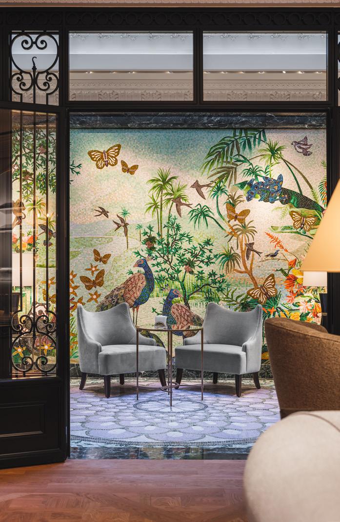 For the ultimate in quiet luxury, escape to 1 Place Vendôme, Paris, an intimate boutique hotel in an 18th-century building that houses luxury jeweler Chopard. Bearing the name of a gemstone, each room or suite is exquisite, but the true masterpiece is a secret sanctuary showcasing a Winter Garden by Fantini Mosaici. Here, a captivating landscape of peacocks, butterflies, monkeys, pandas, exotic birds, and tropical flowers awaits. Thousands of hand-cut tiles in sapphire, ruby, emerald, and gold tones adorn the walls, while turquoise stones form a mosaic floor that unfurls. The hotel might embody whisper-quiet luxury, but the Winter Garden is a stunning display of beauty and craftsmanship.