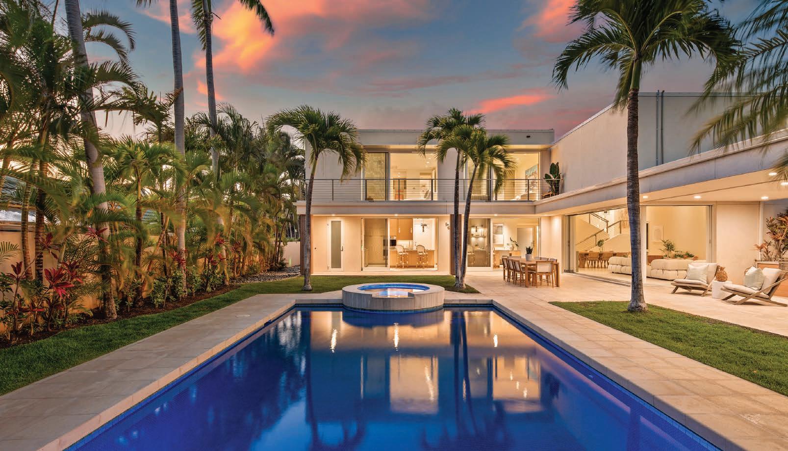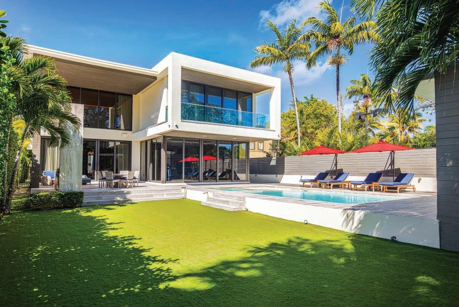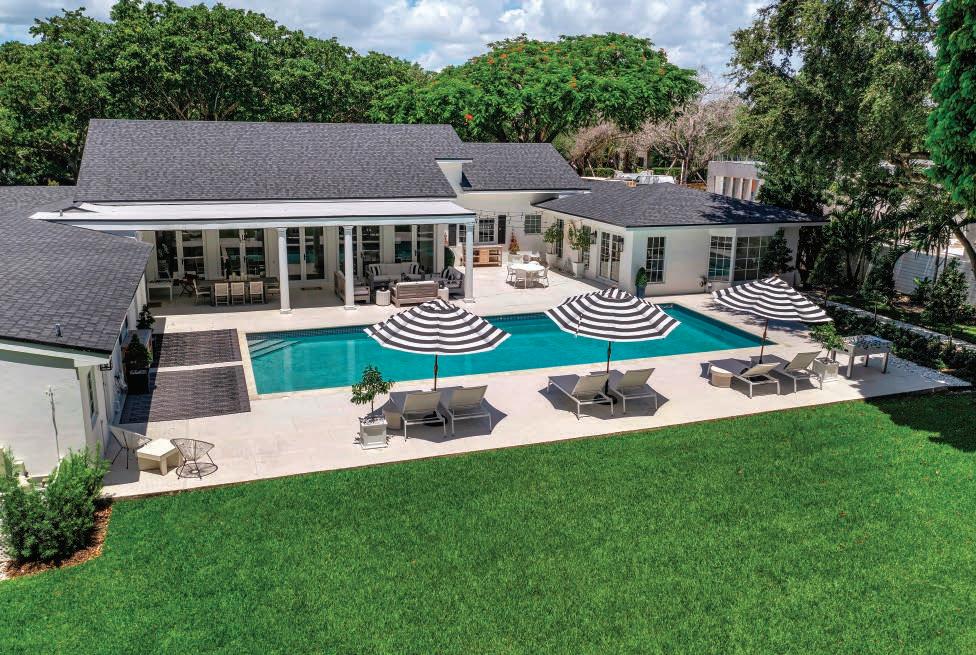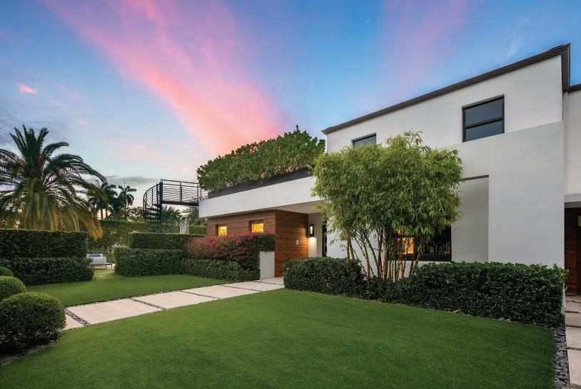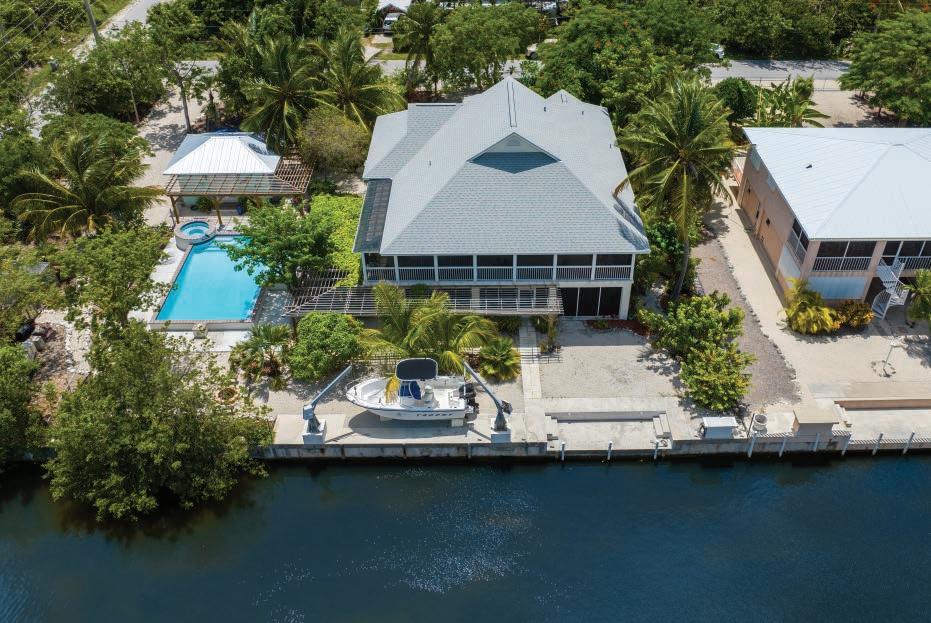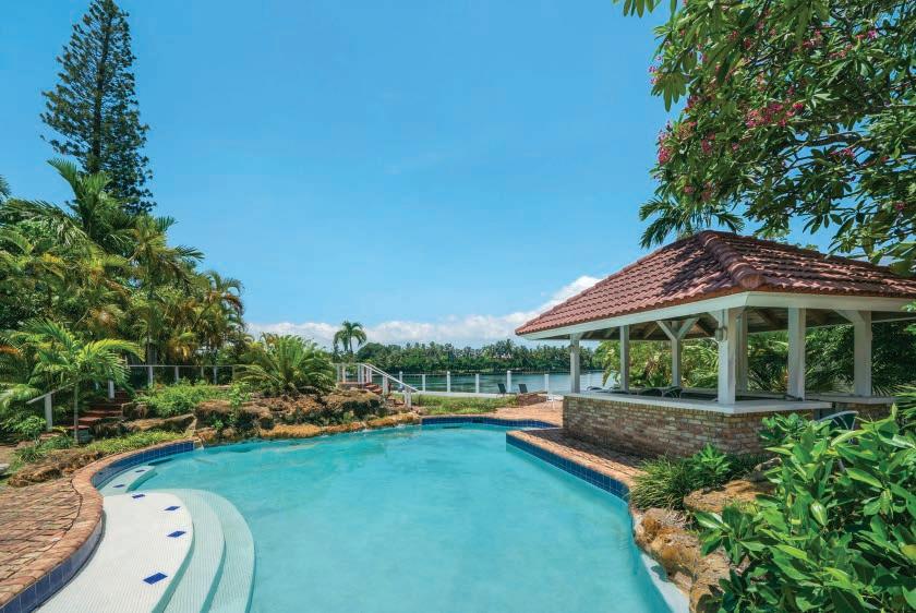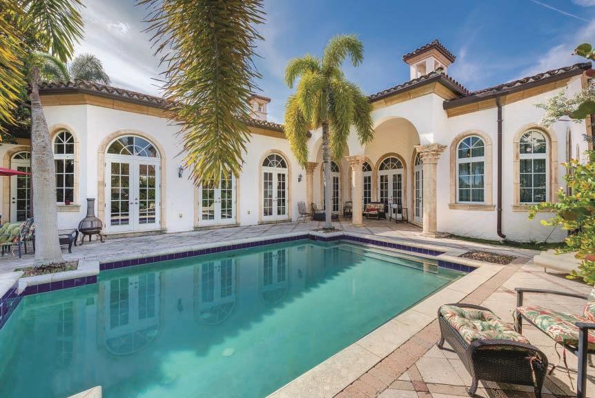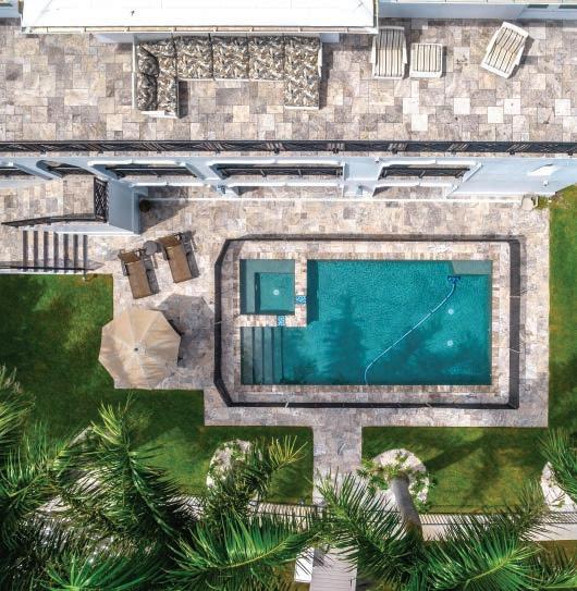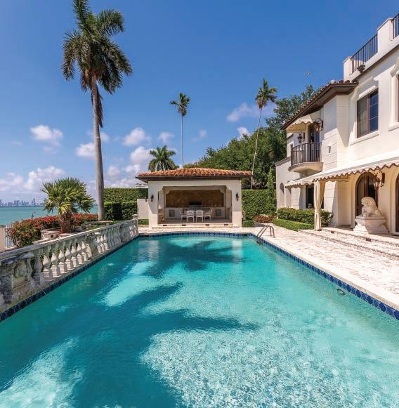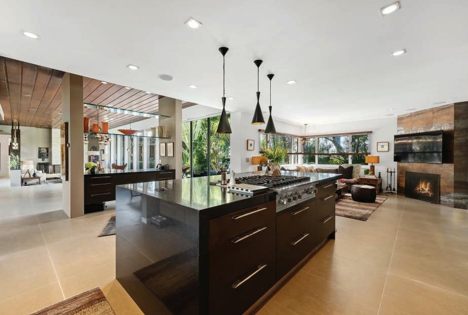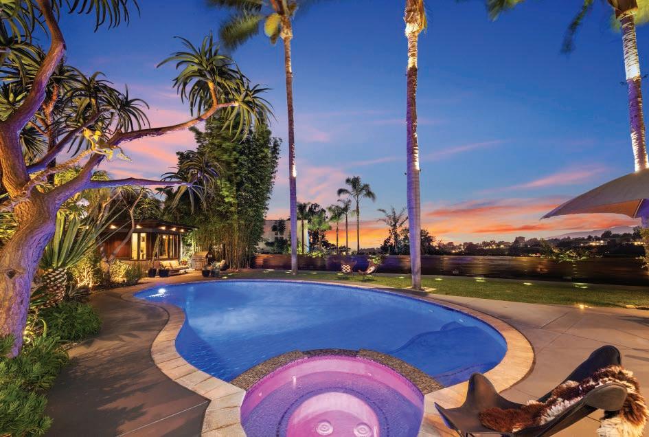 pool pavilion with direct poolside views. The 2nd-level primary suite offers beautiful hardwood floors, wood-slatted walls, a spa-like bath complete with solid terrazzo stone soaking tub plus separate walk-in shower, and balcony, all overlooking the pool and landscaped grounds below. A lovely suite on the ground level doubles as a secondary primary suite and provides separation for guests. The kitchen offers 2 large islands with counter seating, professional appliances, wine captain, wet bar, dual ovens and more! Numerous specialty fixtures and features are a part of this gorgeous home… it’s simply fabulous!