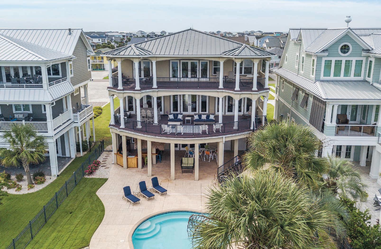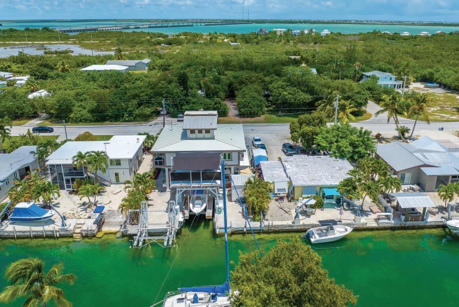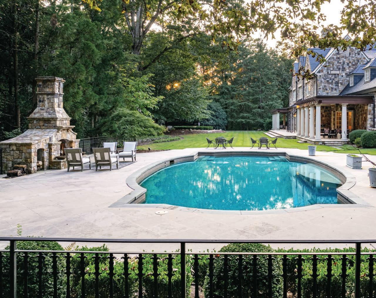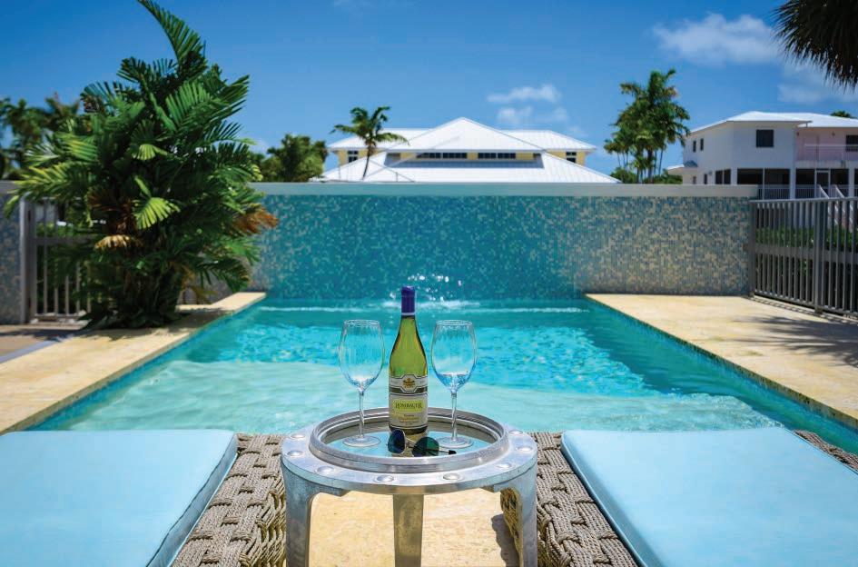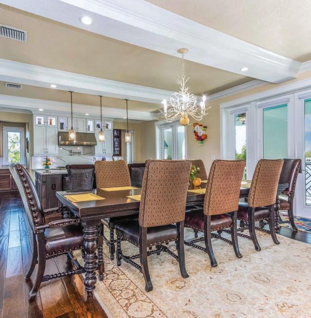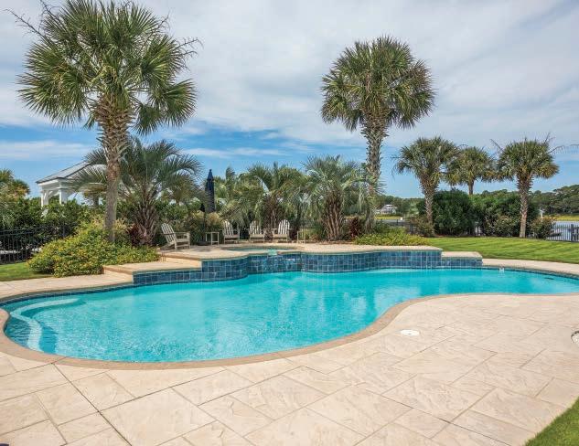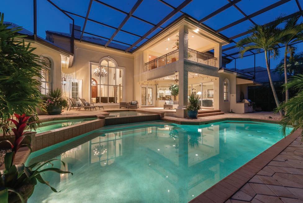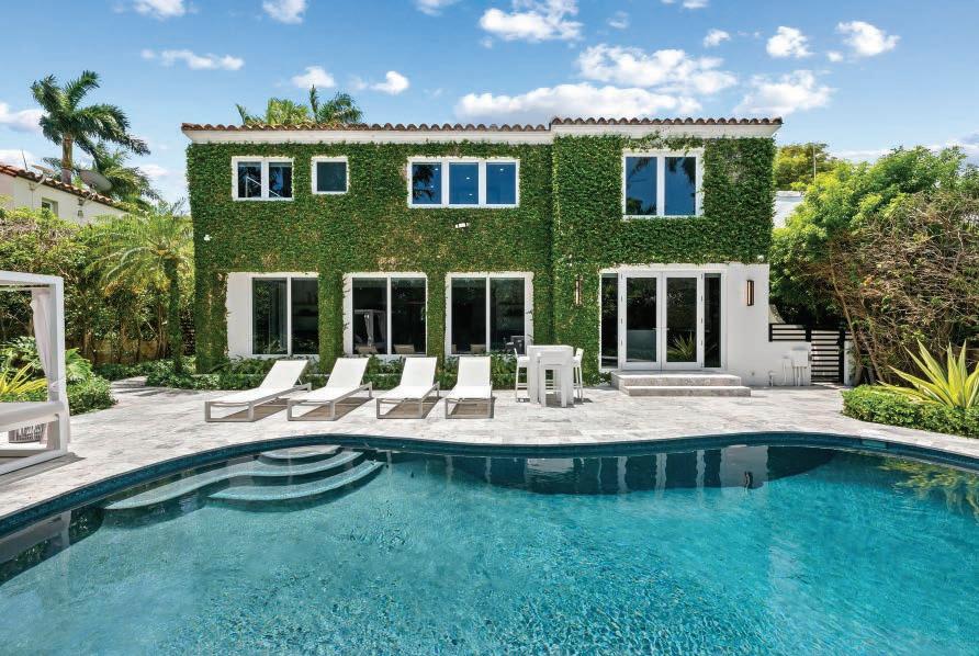 pool pavilion with direct poolside views. The 2nd-level primary suite offers beautiful hardwood floors, wood-slatted walls, a spa-like bath complete with solid terrazzo stone soaking tub plus separate walk-in shower, and balcony, all overlooking the pool and landscaped grounds below. A lovely suite on the ground level doubles as a secondary primary suite and provides separation for guests. The kitchen offers 2 large islands with counter seating, professional appliances, wine captain, wet bar, dual ovens and more! Numerous specialty fixtures and features are a part of this gorgeous home… it’s simply fabulous!