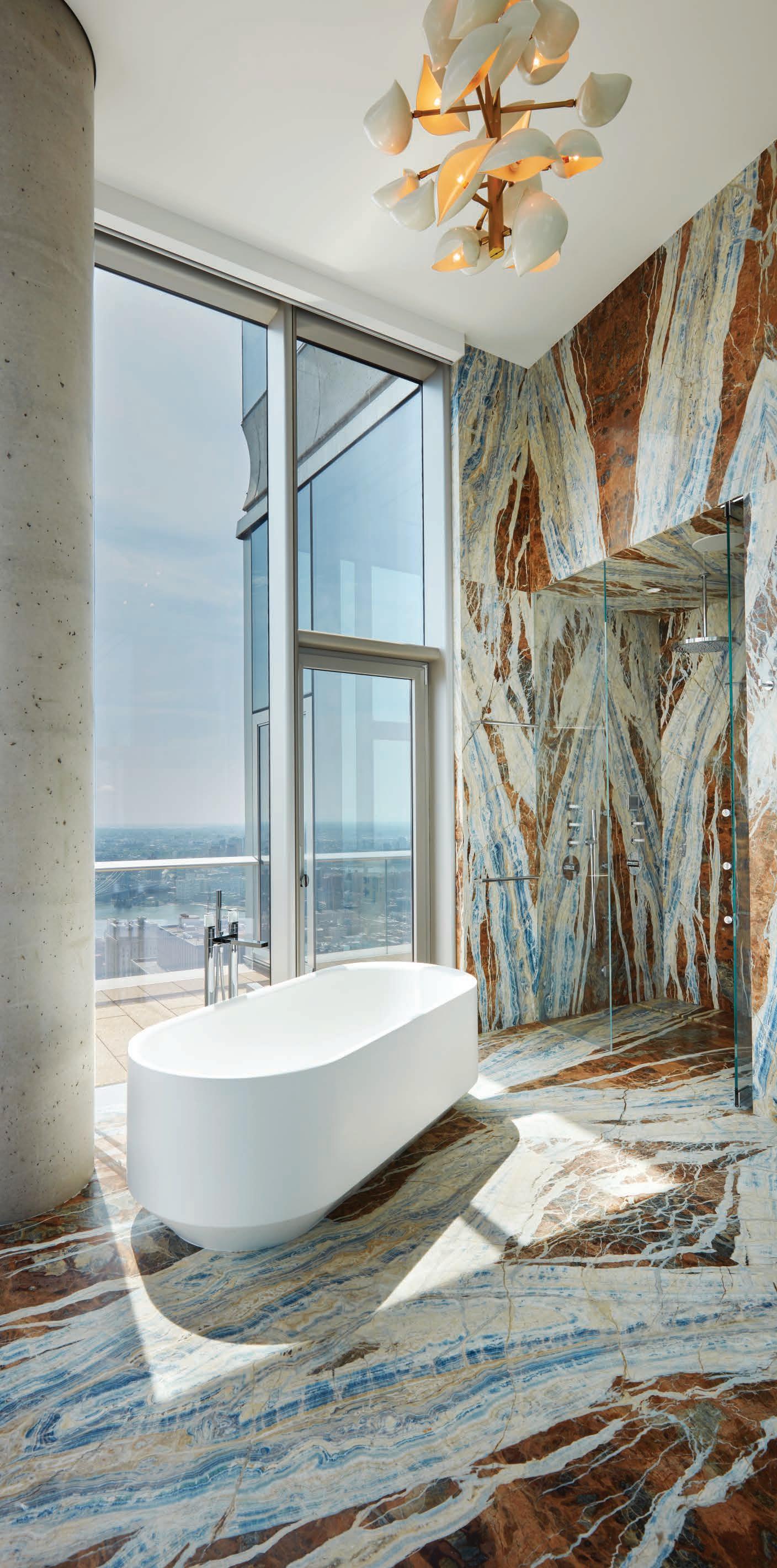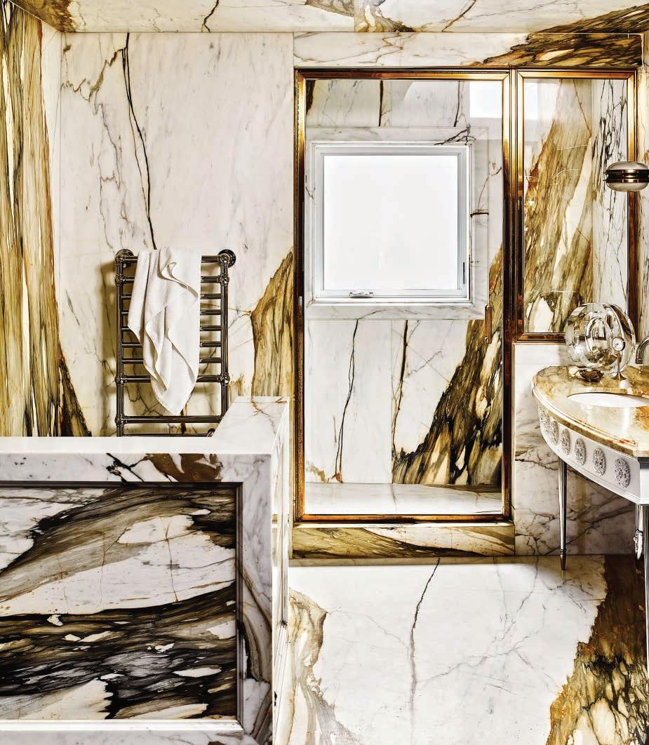 More recently, Gwyneth Paltrow’s Romanekdesigned Montecito, CA manse, the February 2022 Architectural Digest cover model, featured a conversation-starting, massive, freestanding, blush marble bar by New York architectural firm Roman and Williams in the living room. For pure glamor that takes nature to its most spectacular, nothing captivates like a bathroom entirely sheathed in Cassiopeia marble from AD100 New York designer and founder of his namesake design firm, Richard Mishaan.