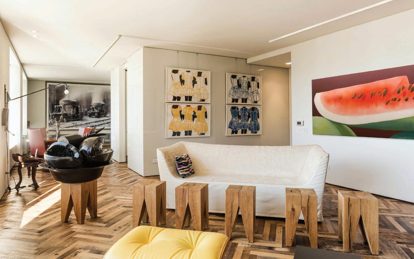 “Lewis used reclaimed herringbone wood flooring, on which a vast artwork collection is exhibited in striking contrast.”