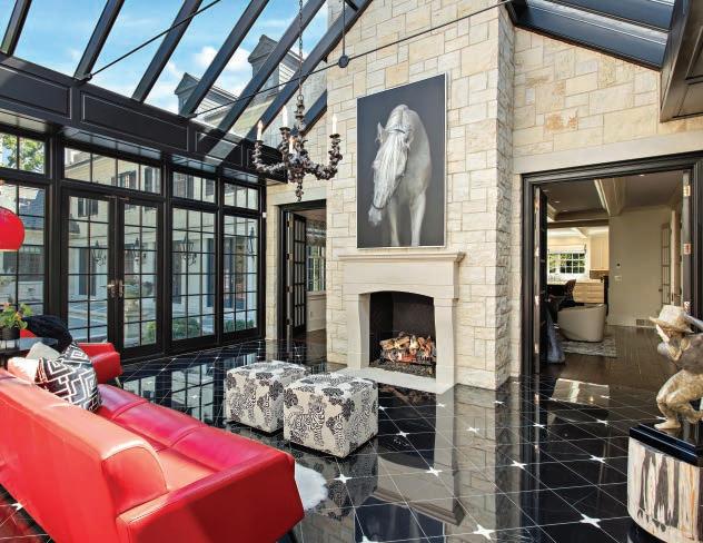 CLOCKWISE FROM LEFT: Leather cladding turns a staircase into an art piece; reclaimed wood floors in a herringbone pattern are the perfect foil for modern furnishings and bold art; a dark stone fireplace creates a focal point in an otherwise neutral space.