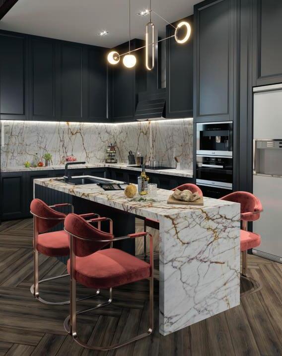 Exotic marble is especially having its moment, breaking out of the shadow of white and gray with bold hues and richly veined patterns.