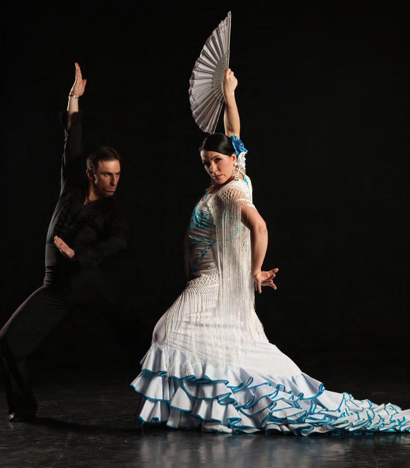 A man and woman in traditional flamenco attire share an intense moment mid-dance.