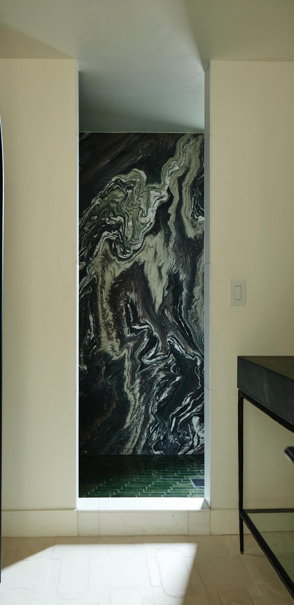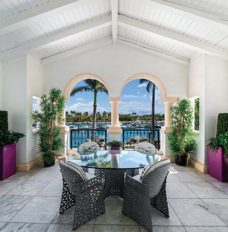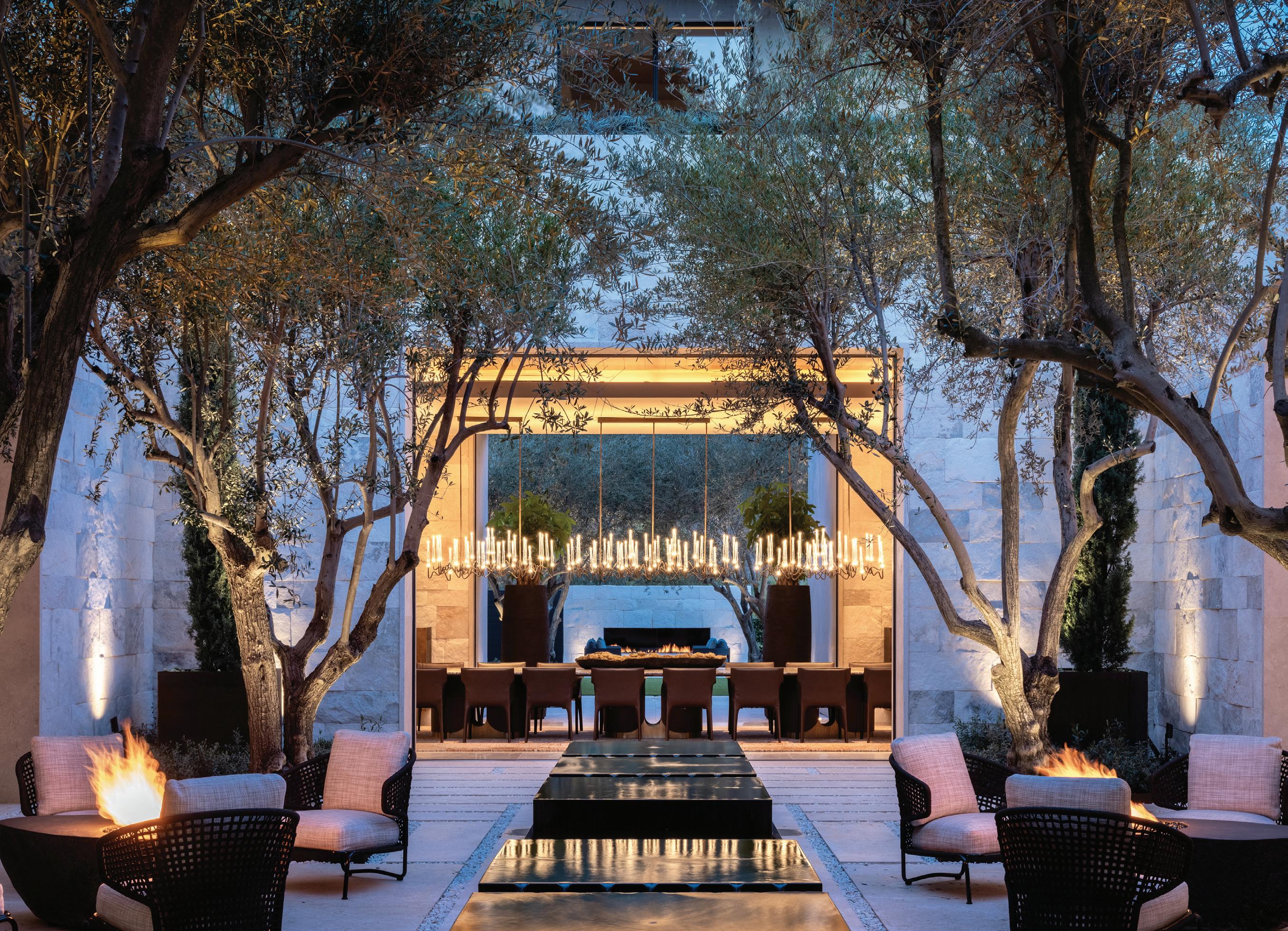 Interior designer Errol Dejager helped create a home designed for sophisticated living and top-notch entertaining. The palatial residence offers a custom show kitchen featuring double islands, clad-in white oak with Taj Mahal Quartzite countertops, a cook’s kitchen, kitchenette for staff, 10 bedrooms, and a grand, entertainer’s dream dining room with ample seating for 20. Other highlights include a dedicated children’s area, elevated $1M Dolby Atmos theater, infinity pool and spa, open halfcourt sports court, fitness center, and Hurley and McKillen’s personal favorite: the serene central courtyard flecked with lush olive trees. “[The courtyard] is an homage to Persia, symbolizing peace, wisdom, and prosperity. The olive tree also symbolizes spirituality, renewal, and divine presence,” they explain. “All materials used throughout Villa Elia are meant to evoke a sense of peace, sanctuary, and serenity, re-awakening the grandeur of the past.”