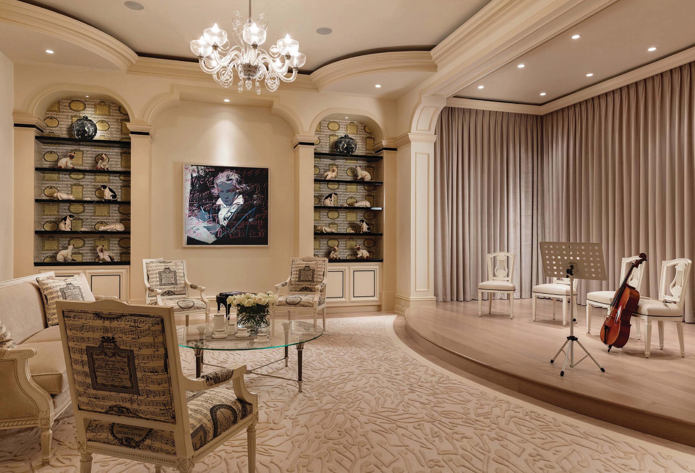 Interior designer Errol Dejager helped create a home designed for sophisticated living and top-notch entertaining. The palatial residence offers a custom show kitchen featuring double islands, clad-in white oak with Taj Mahal Quartzite countertops, a cook’s kitchen, kitchenette for staff, 10 bedrooms, and a grand, entertainer’s dream dining room with ample seating for 20. Other highlights include a dedicated children’s area, elevated $1M Dolby Atmos theater, infinity pool and spa, open halfcourt sports court, fitness center, and Hurley and McKillen’s personal favorite: the serene central courtyard flecked with lush olive trees. “[The courtyard] is an homage to Persia, symbolizing peace, wisdom, and prosperity. The olive tree also symbolizes spirituality, renewal, and divine presence,” they explain. “All materials used throughout Villa Elia are meant to evoke a sense of peace, sanctuary, and serenity, re-awakening the grandeur of the past.”