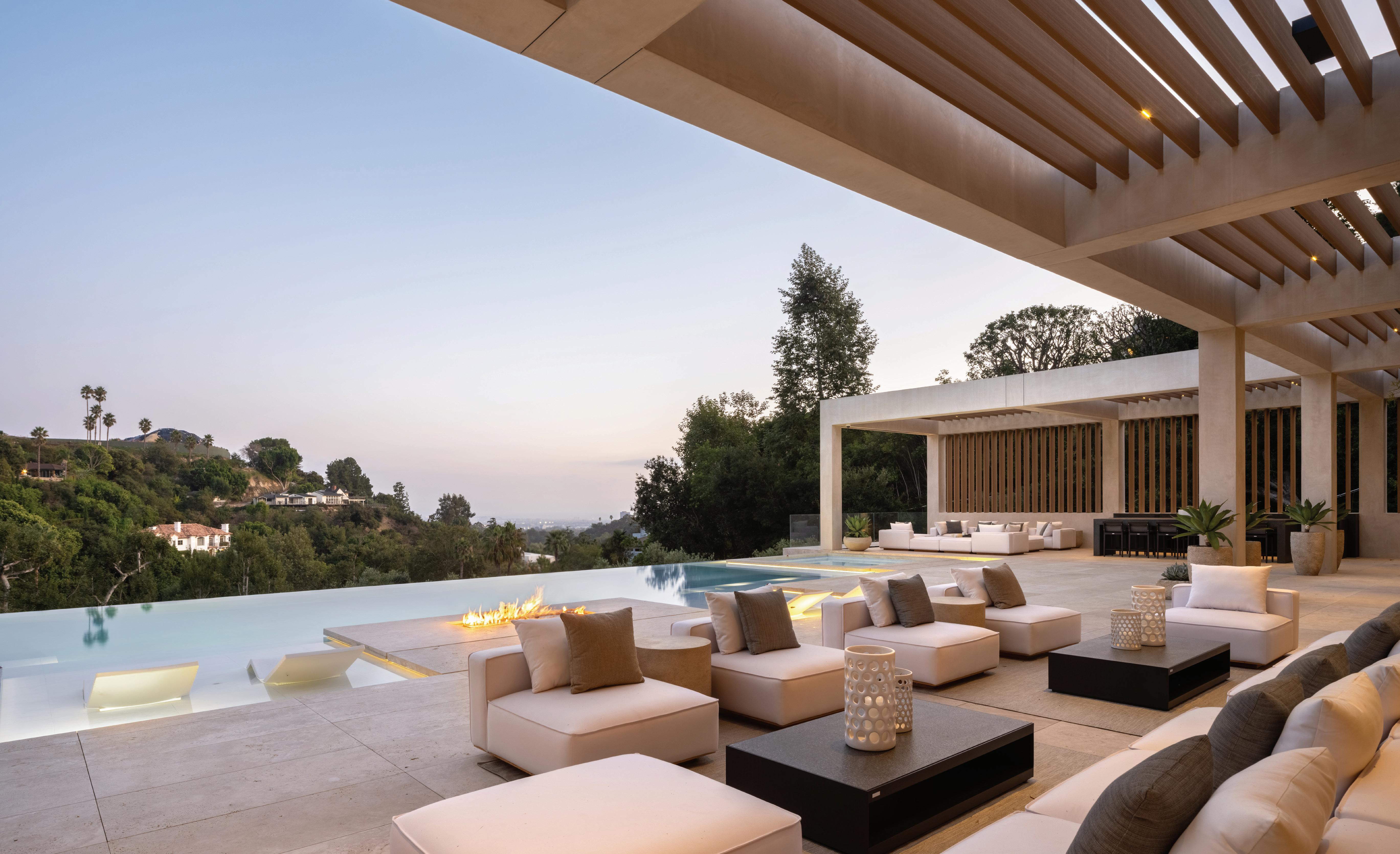 “Villa Elia Bel Air is an idyllic estate enveloped in serenity, unifying natural splendor with cutting-edge technology and modern functionality,” explain Plus Real Estate agents Andrew Hurley and Tyrone McKillen. “It truly feels like an escape to a luxury resort. [It is] vast in scale yet intimate in design, with diverse spaces for living, relaxing, and entertaining. The property brings to life a timeless grandeur and sophisticated simplicity, with the French Riviera and Mediterranean villas as its muse.” The property’s countless water features evoke a sense of fluidity and softness, while the fire pits and other fire moments bring