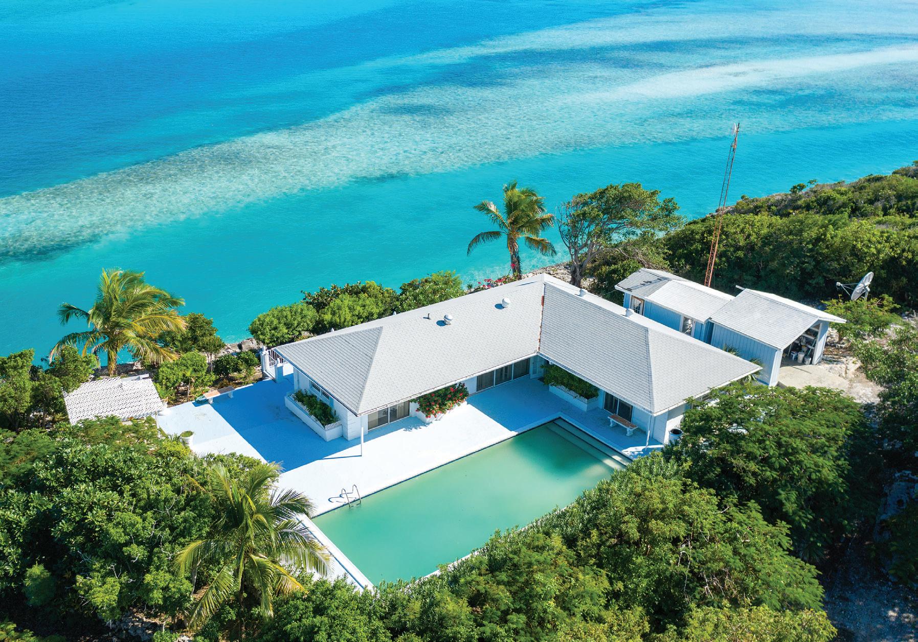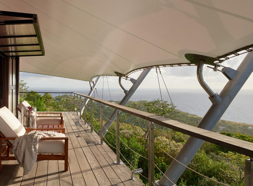 pier slated for demolition, its weather-worn planks repurposed for floorboards, decks and louvers. Rather than detracting from the aesthetics, the existing dents and scars present an alluring patina and sense of provenance. Overcoming the challenges of construction on a remote island, structures were prefabricated and shipped to the building site, 650 feet above sea level. “This was a collaborative, international project that brought together professionals from diverse cultures,” reports Hertz, citing an American architect, British clients, German engineers and an Indonesian team coordinating with local Caribbean workers.