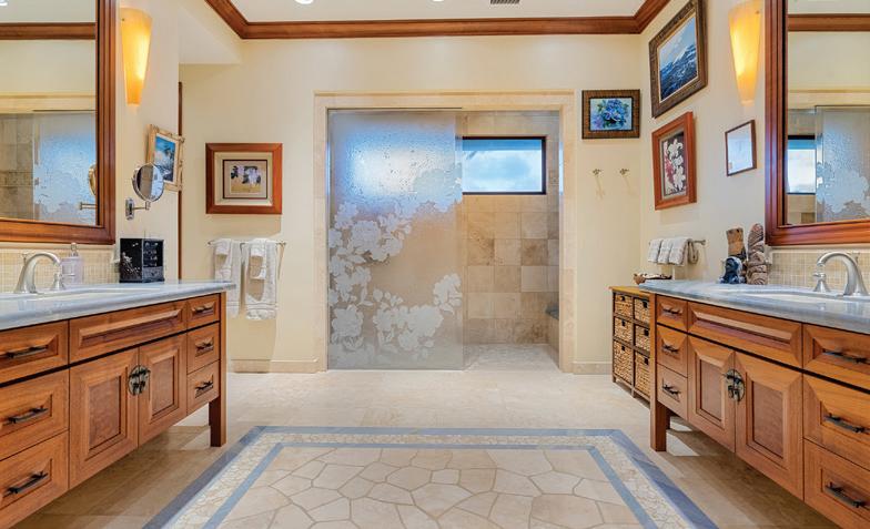 “The wellness suite in this home is impressive and was designed with water views from the workout floor to the Jacuzzi. Built-in art accents the Jacuzzi tile work and natural light. A wet bar with cabinets equips this space,” Benedict says, “to be a true wellness suite without the need to return to the kitchen or other areas of the home. Truly, a full spa/gym experience without having to leave.”